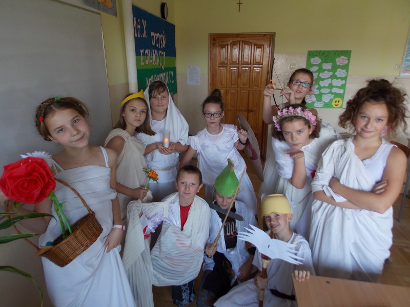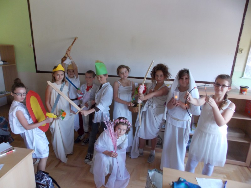 Uczniowie klasy V wcielili się dziś w role bogów greckich. Podczas lekcji języka polskiego prezentowali nie tylko stroje, ale przede wszystkim rozmaite informacje na temat postaci, w które się wcielili. Każdy wykazał się pomysłowością w doborze odpowiednich atrybutów dla swojego bohatera. Lekcja była doskonałym przykładem nauki przez zabawę.