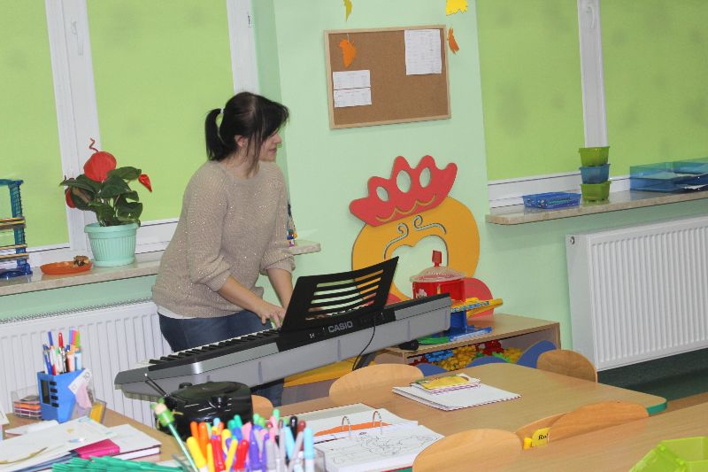 Asystentka nauczyciela wychowania przedszkolnego p. Katarzyna Koseska w ramach swojej pracy powadzi zajęcia umuzykalniające dla dzieci z przedszkola.