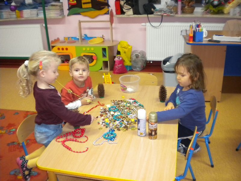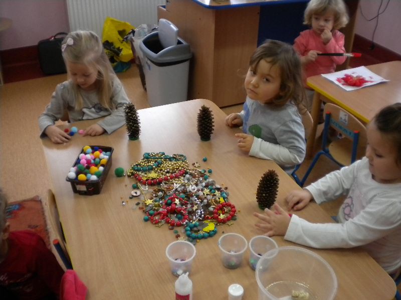Okres świąteczny to czas przygotowania różnych ozdób, bombek oraz choinek z szyszek. Wszystkie te rzeczy wykonały dzieci z grupy ,,Biedronki” pod czujnym okiem wychowawczyń, które będą sprzedawane na przedszkolnym kiermaszu.