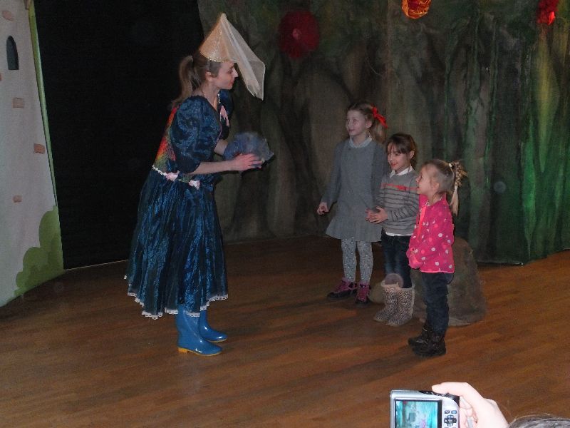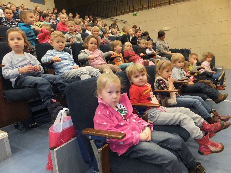 Najpierw obejrzały przedstawienie pt. ,,Szewczyk Dratewka”. Dzieci miały okazję poznać przygody Szewczyka odgrywane przez aktorów i lalki teatralne. Przedszkolaki oglądały przedstawienie z wielkim zainteresowaniem. Było to dynamiczne i przepełnione humorem widowisko, z barwną scenografią i różnorodnym podkładem muzycznym. Przez cały występ z twarzy dzieci nie znikał uśmiech, co jest najlepszym dowodem na to, że przedstawienie bardzo im się podobało.