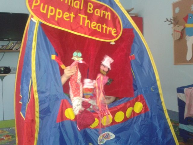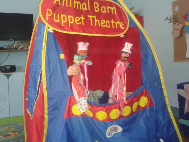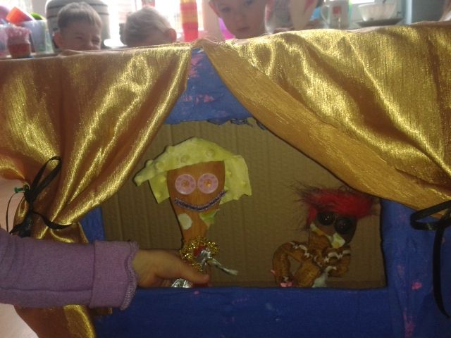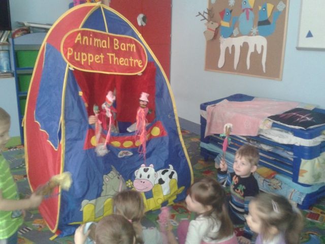 Teatr to jest widownia i scena. Niby nic magicznego , ale dzieci z grupy Żabek siedziały jak zaczarowane. Bardzo wiele radości sprawiło im również to , że sami mogli wystąpić w teatrzyku i przedstawić niesamowitą historię własnoręcznie zrobionej łyżeczkowej lalki.