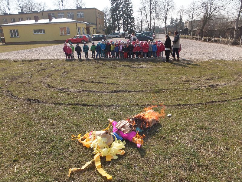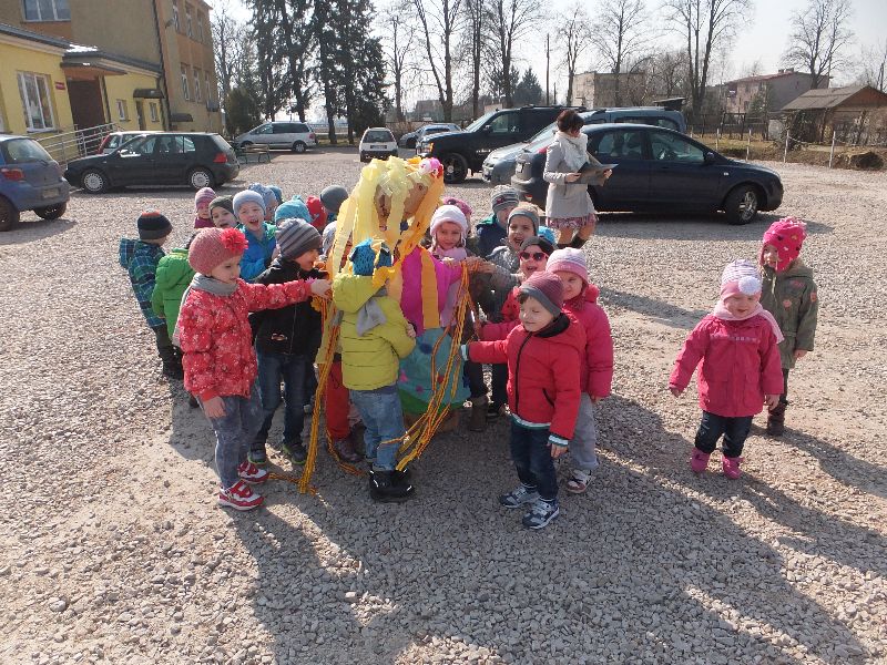 20 marca obchodziliśmy I dzień wiosny. Przedszkolaki uczestniczyły w grach i zabawach nawiązujących do rozpoczynającej się pory roku. Następnie z Marzanną ruszyliśmy wesołym korowodem pożegnać zimę. Wiosna żeby nas usłyszała i szybciej nastała, krzyczeliśmy ,,Żegnaj zimo, witaj wiosno!”. Jak to w tradycji ludowej, kukłę Marzanny spaliliśmy i w ten sposób zimę pożegnaliśmy.