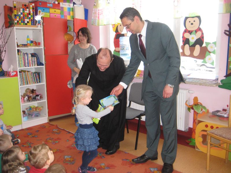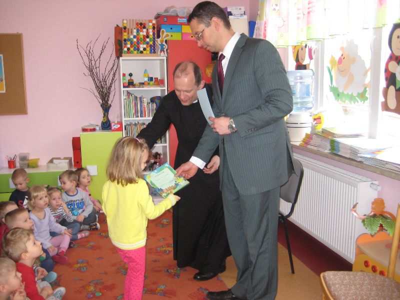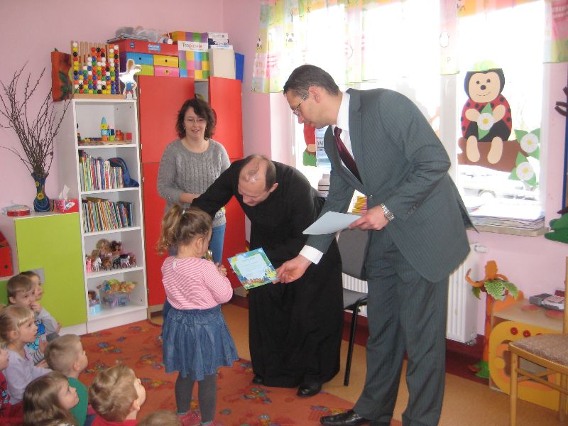 31 marca br do przedszkola przyjechał ks proboszcz Adam Wyszyński z parafii w Kazuniu Polskim, aby wraz z dyrektorem Zespołu Szkolno-Przedszkolnego wręczyć nagrody za rodzinny konkurs „RODZINNA KARTKA WIELKANOCNA”. Dzieci zadawały dużo pytań w związku z nadchodzącymi Świętami Wielkanocnymi i wykazały się ogromną wiedzą na temat tradycji wielkanocnych. Ks proboszcz przybliżył dzieciom tajemnicę zmartwychwstania opowiadając o Niedzieli Palmowej, grobie Pana Jezusa i święceniu pokarmów . Na zakończenie wszystkie przedszkolaki zaśpiewały piosenkę „TĘCZA”.