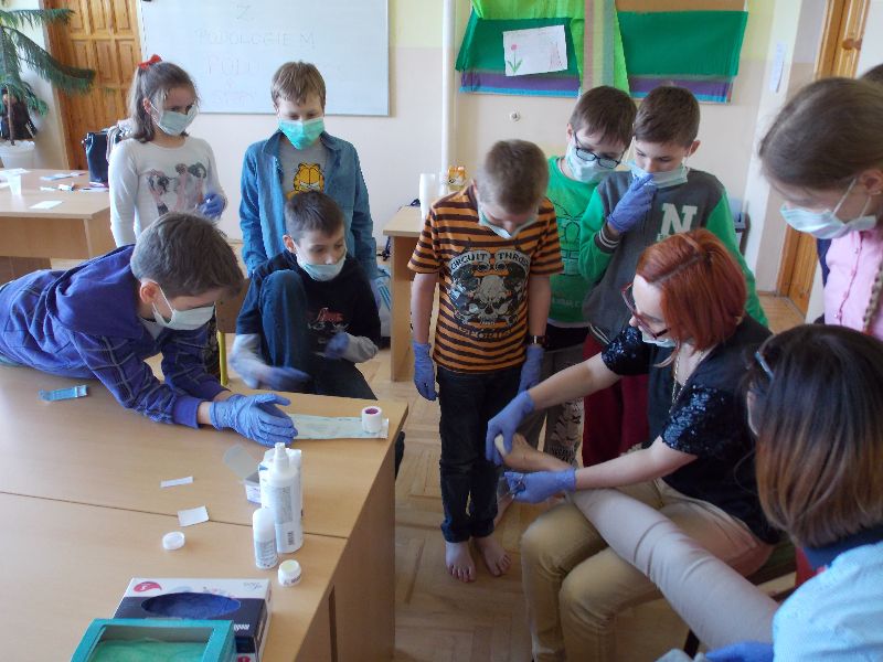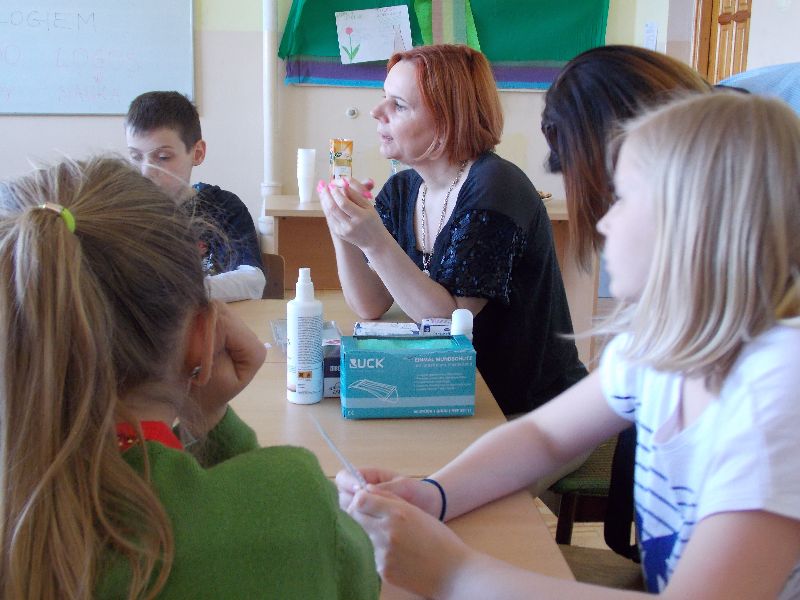 Dnia 23.04.2015r. uczniów naszej szkoły odwiedziła pani podolog. Dzieci miały okazję poznać nowy, nieznany zawód, którego korzenie sięgają czasów starożytnych. Pani Małgorzata Wojnicz z Gabinetu Zdrowia i Urody w Nowym Dworze Mazowieckim przywiozła podstawowe narzędzia pracy. Po krótkiej prelekcji każdy uczeń założył maseczkę, rękawiczki i zbadał swoje stopy. Dużym zainteresowaniem cieszył się aparat do sprawdzania nieprawidłowości w obrębie stóp. Po wnikliwej obserwacji grupa doskonale rozponawała prawidłowości i ewentualne zagrożenia dotyczące stóp. Spotkanie przebiegło w bardzo sympatycznej atmosferze.