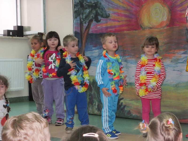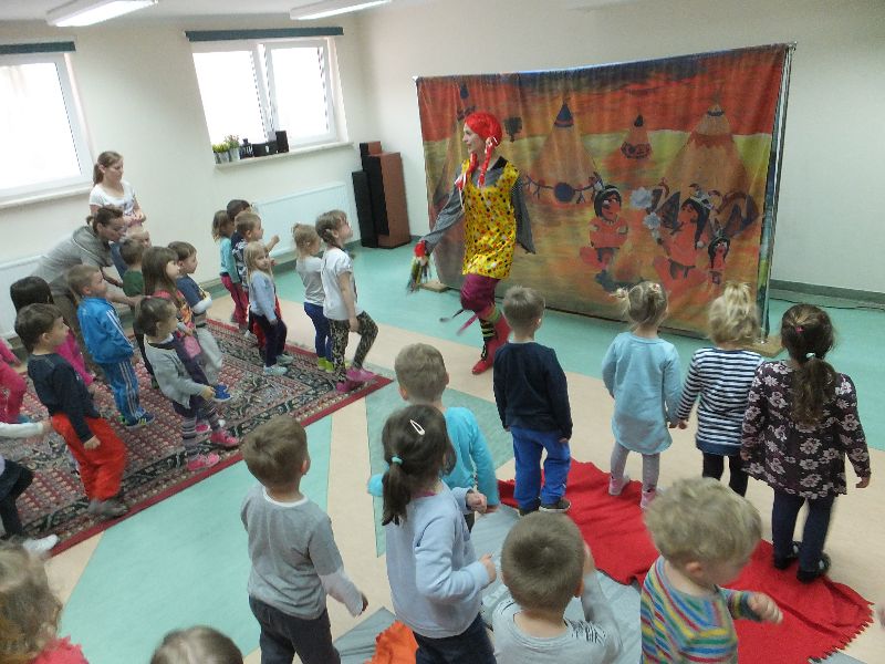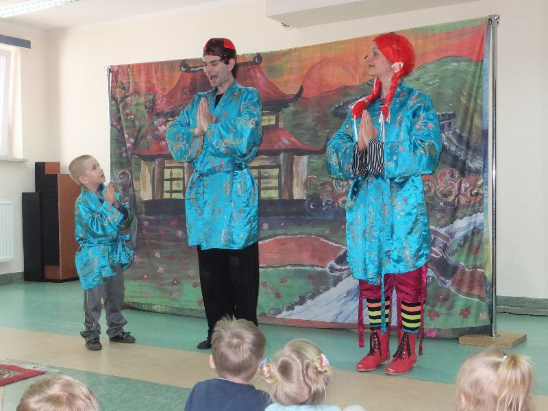 W dniu 13 maja br. pojechaliśmy do Gminnej Biblioteki Publicznej w Czosnowie na teatrzyk ,,Pipi Wędrowniczka” w wykonaniu teatru ,,Urwis”. Razem z główną bohaterką wybraliśmy się w podróż dookoła świata. Odwiedziliśmy Hawaje, Chiny, a nawet dziki zachód. Przedszkolaki wspaniale się bawiły przy wspólnych pląsach i chętnie brały udział w zadaniach przygotowanych przez aktorów. Nauczyły się między innymi tańca hula, chińskiego pozdrowienia i indiańskich okrzyków. Ich uśmiechnięte buzie są najlepszym dowodem na to, że świetnie bawiły się podczas przedstawienia. Składamy serdeczne podziękowania wójtowi Gminy Czosnów panu Antoniemu Kręźlewiczowi za nieodpłatne użyczenie autokaru gminnego.