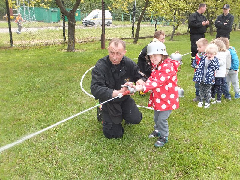 W czwartek 14 maja br. wybraliśmy się na wycieczkę do Komendy Powiatowej Państwowej Straży Pożarnej w Nowym Dworze Mazowieckim. Dzieci poznały trudną i odpowiedzialną pracę strażaków: mogły z bliska oglądać wozy strażackie, sprzęt gaśniczy, usłyszały sygnał alarmowy, wysłuchały również opowieści o niebezpiecznej pracy strażaka i akcjach ratowniczno-gaśniczych. Przedszkolaki dowiedziały się w jakich okolicznościach można wezwać Straż Pożarną i że strażacy nie tylko gaszą pożary, ale również są wzywani do wypadków samochodowych, do pomocy podczas powodzi. Utrwalony został także numer alarmowy – 998, który każde dziecko powinno znać.