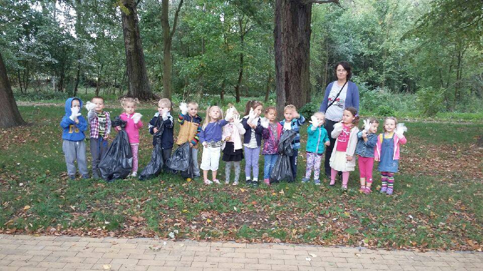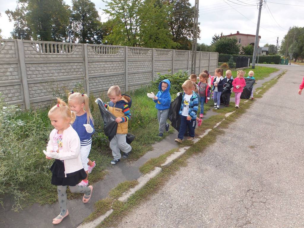 Kształtowanie postaw proekologicznych jest jednym z ważniejszych celów edukacji przedszkolnej. Dzieciom już od najmłodszych lat wpajamy, że ,,jeśli świat będzie czysty – zdrowa będzie żywność, powietrze, woda...”. Akcja ,,sprzątania świata” jest świetną okazją, aby uświadomić dzieciom jak wiele dobrego człowiek może zrobić dla środowiska poprzez właściwe zachowanie. Dlatego też w dniu 18 września przedszkolaki z gr. ,,Pszczółki” oczyszczały z odpadów najbliższą okolicę. Akcja odbywała się w formie zabawy. Dzieci dowiedziały się, że należy dbać o przyrodę oraz chronić ją, by korzystać z jej uroków. Były pełne entuzjazmu, prześcigały się w noszeniu worków. „Uzbrojone” w rękawice ochronne i plastikowe worki na odpady przemierzały znajome uliczki.