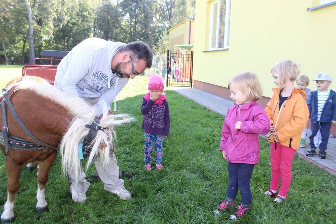 We wtorek 22 września 2015 r. do naszego przedszkola zawitał specjalny gość- kucyk. Składamy serdeczne podziękowania panu Rafałowi Miłoskowi, który w zeszłym roku przyjechał do przedszkola poprowadzić z dziećmi bezpłatne zajęcia z ceramiki, a w tym przyjechał zapoznać dzieci z Kucykiem. Przedszkolaki nie tylko chętnie pozowały do zdjęć, ale zadbały o to, by kucyk nie był głodny.