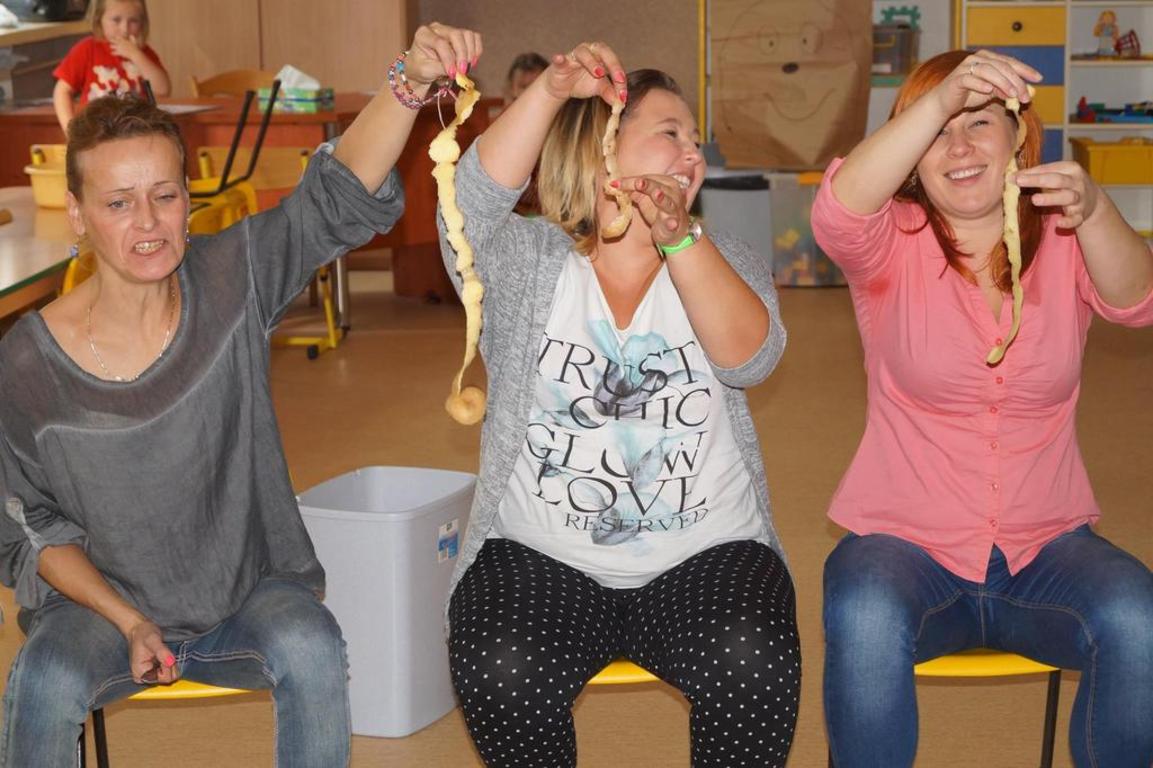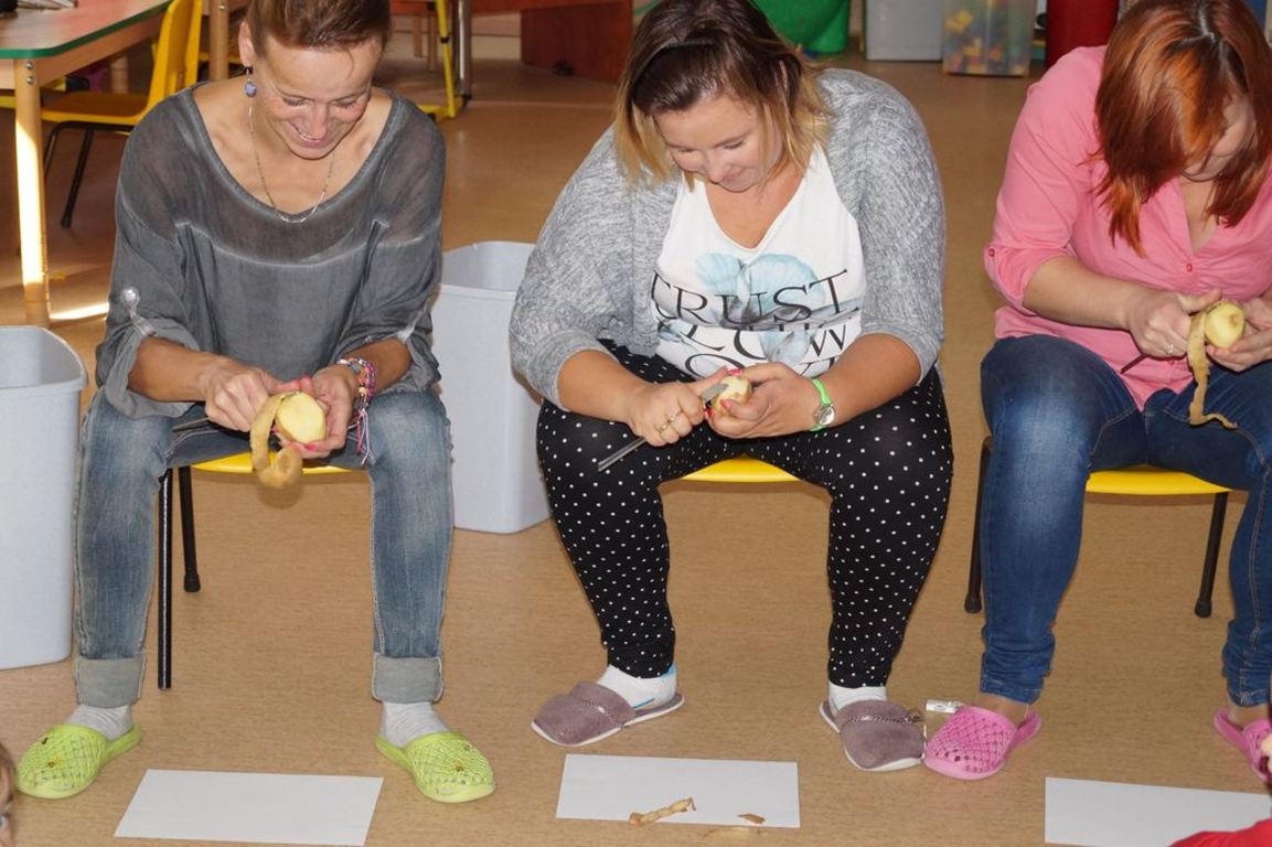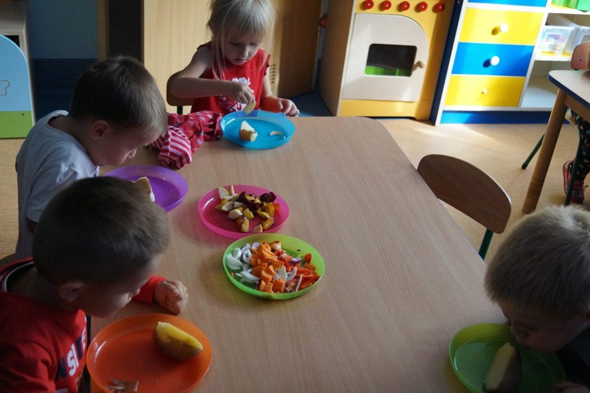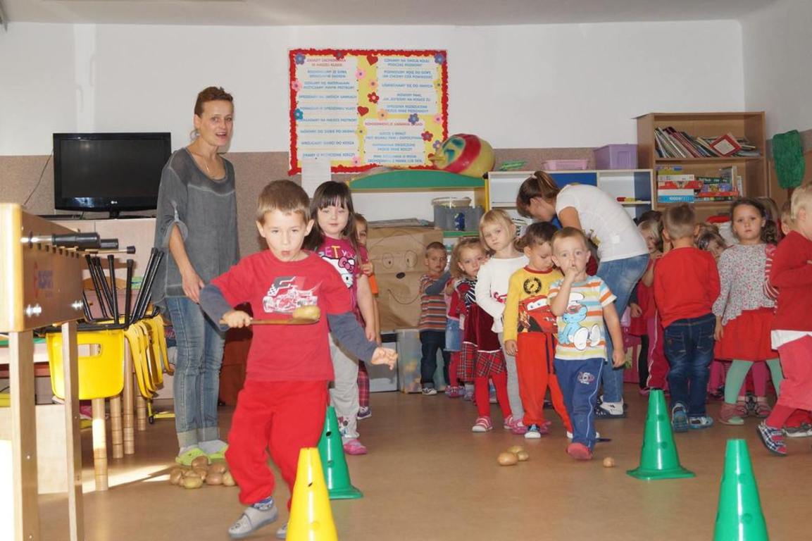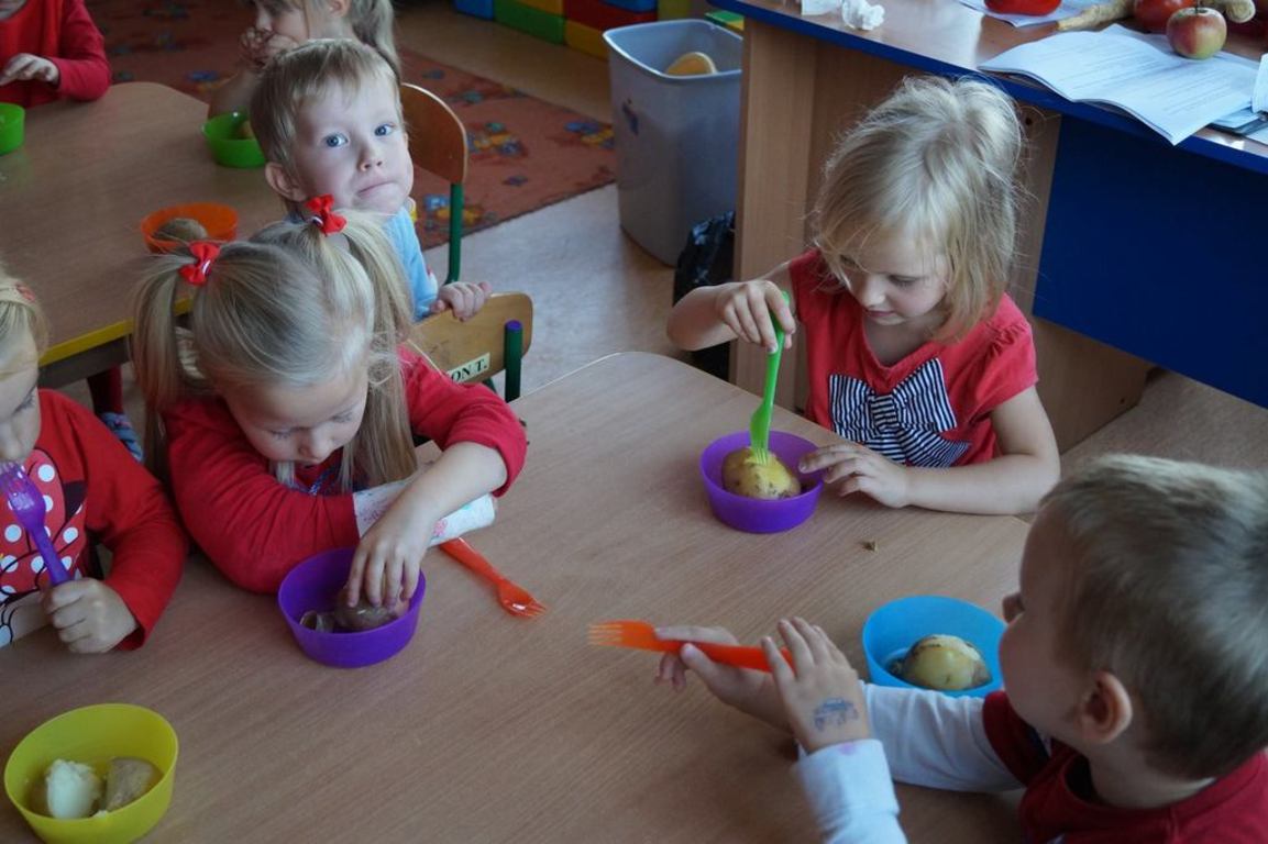 W środę 23 września w naszym Przedszkolu obchodziliśmy Pierwszy Dzień Jesieni pod hasłem "Święto pieczonego ziemniaka". Ubrane na czerwono dzieci na początek zapoznały się z wyglądem i smakiem jesiennych owoców i warzyw - Żabkom smakowała nawet cebula! Następnie oddaliśmy przyniesione przez dzieci ziemniaki do upieczenia paniom z kuchni (podziękowania) a sami dobrze bawiliśmy się w konkurencjach sportowych. Rzut do celu, slalom z kartoflem na łyżce i "wykopki". Po zabawie dzieci zajadały się pieczonymi ziemniakami z masełkiem lub serkiem. Pyyyycha. Kontynuacją święta następnego dnia było wykonanie przez Żabki i Pszczółki figurek Ziemniaka Cudaka.