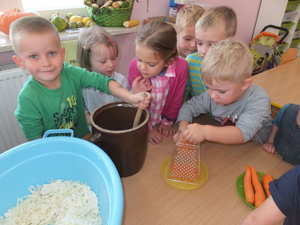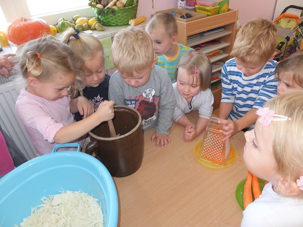 Najpierw dzieci ścierały marchewkę na tarce jarzynowej. Poszatkowaną kapustę i startą marchewkę wrzuciły do glinianego garnka. Przedszkolaki nie zapominały o ich dokładnym ugnieceniu w gliniance tak, aż kapusta puściła sok. Za około dwa tygodnie sprawdzimy, jak smakuje nasza kiszona kapusta!