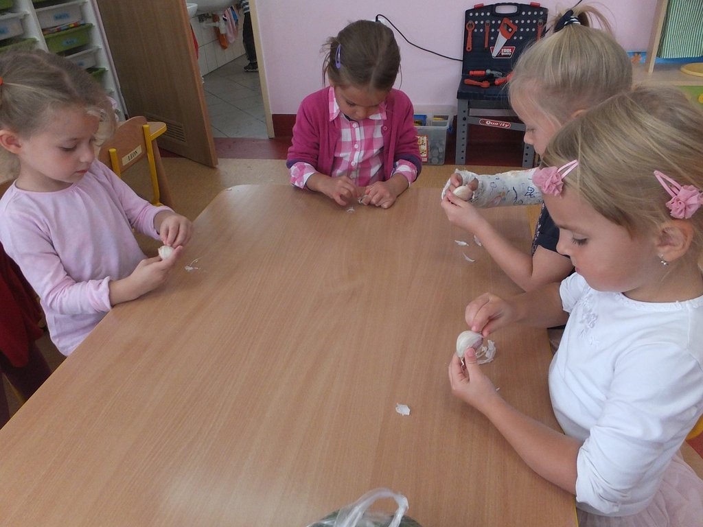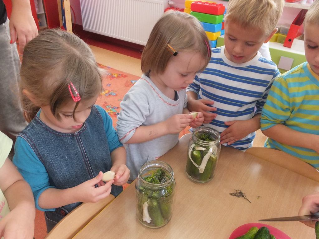 Jesienią w większości domów odbywa się kiszenie ogórków, dzisiaj w naszym przedszkolu również się tym zajmowaliśmy. Najpierw dzieci umyły ogórki, a później przystąpiły do pracy w grupach. Każdy przedszkolak miał jakieś zadanie - układanie ogórków w słoikach, obieranie czosnku i przygotowanie zalewy… Wszystkie ,,Pszczółki” były zaangażowane w pracę i z ciekawością słuchały objaśnień nauczycielki, co i dlaczego należy wykonać. Efektem wspólnej pracy były dwa słoiki pełne ogórków.