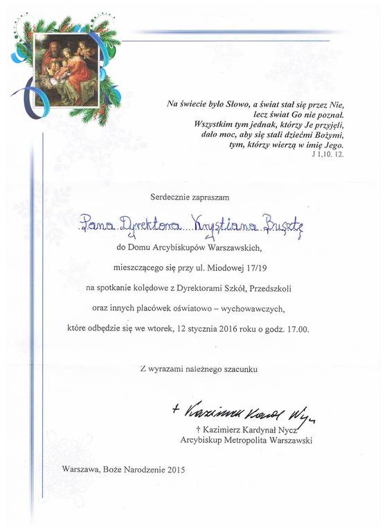 12 stycznia 2016 r.na zaproszenie Jego Eminencji Kardynała Kazimierza Nycza, Arcybiskupa Metropolity Warszawskiego, dyrektorzy szkół spotkali się w Warszawie, aby złożyć sobie życzenia noworoczne, wspólnie kolędować i obejrzeć JASEŁKA.