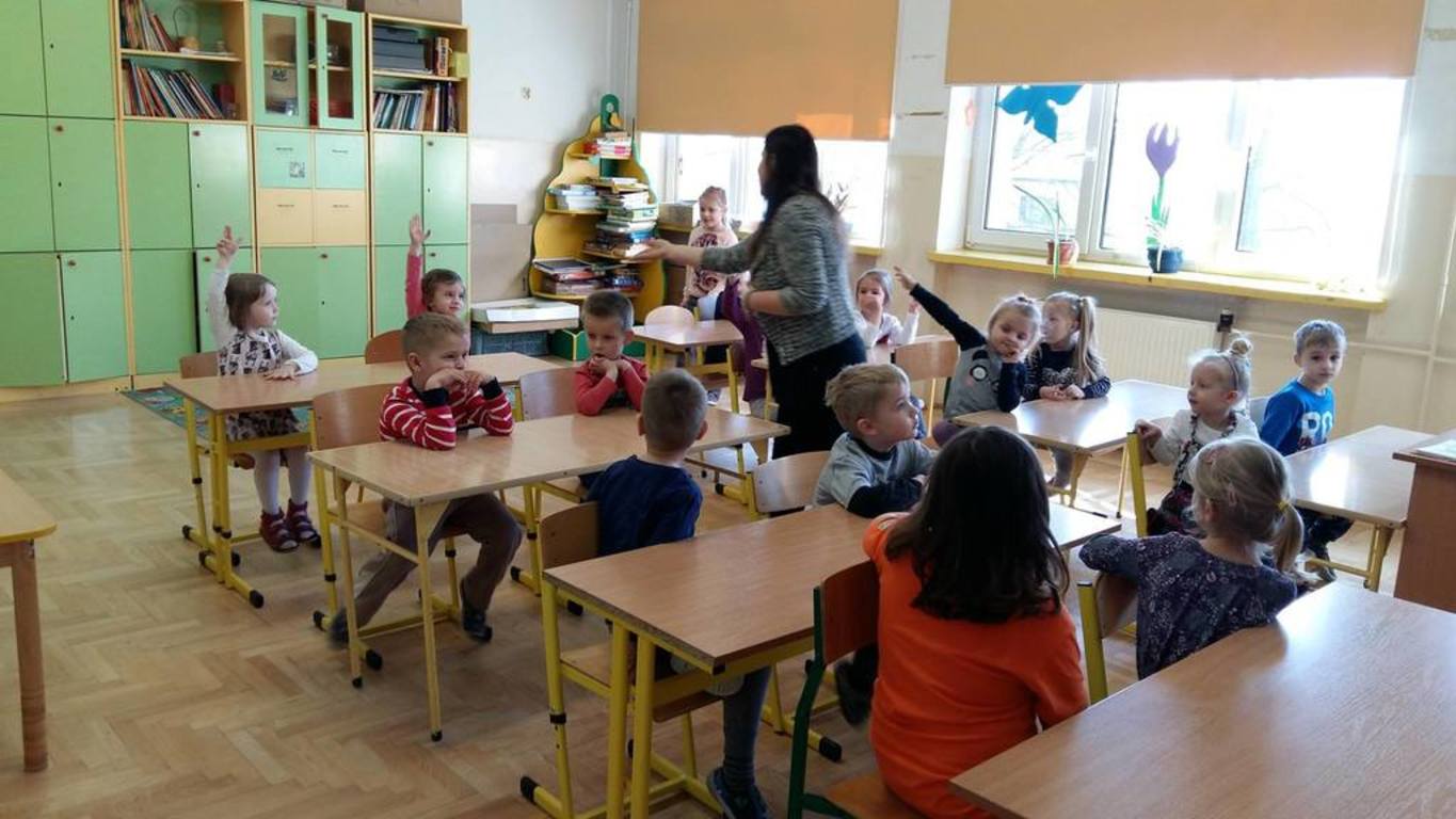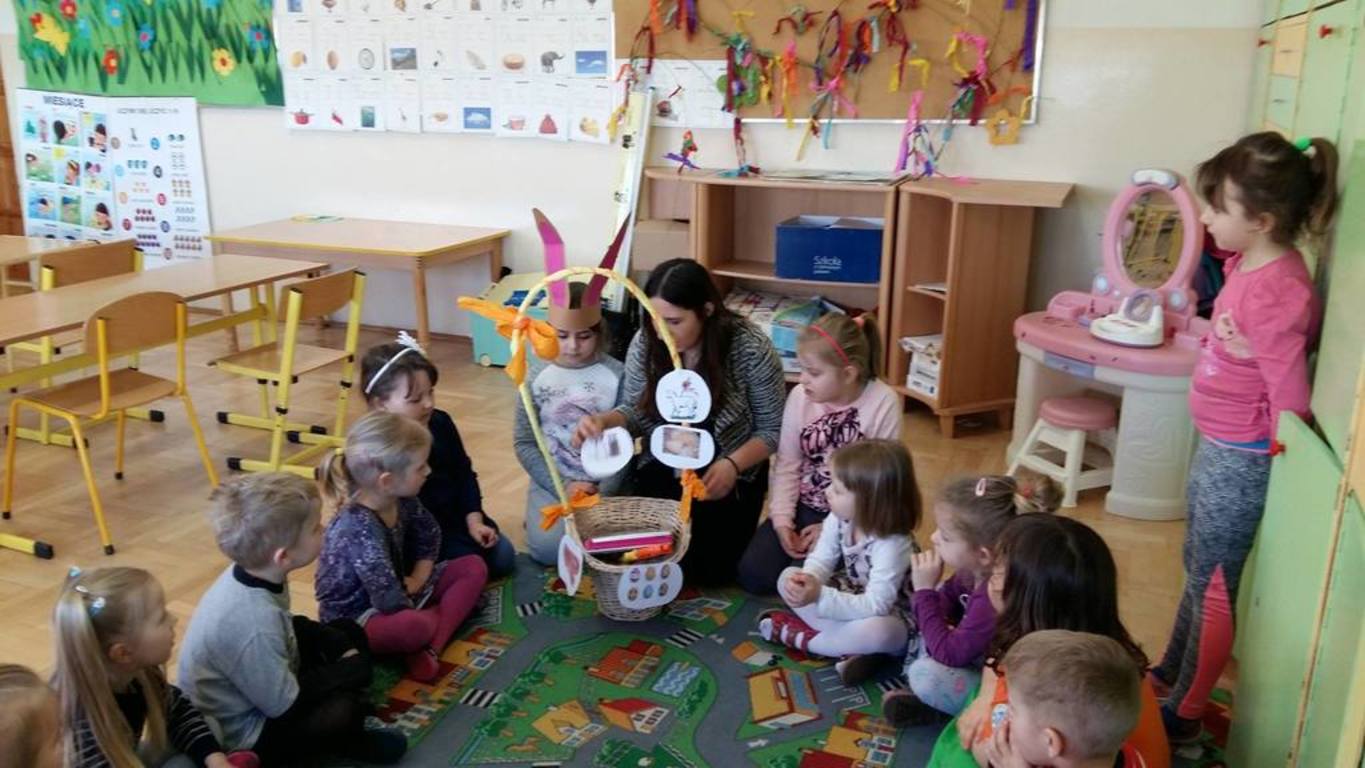 Tuż przed przerwą świąteczną, przedszkolaki z grupy „Pszczółki”, po raz kolejny wybrały się” na szkolną lekcję”, którą tym razem prowadziła Pani Dorota Dzimińska. Lekcja dotyczyła przygotowań do świąt Wielkanocnych oraz zwyczajów jakie są z nimi związane. Na samym początku na przedszkolaki czekała niespodzianka, a mianowicie zajączek wielkanocny, który przygotował kilka zadań dla swoich gości. Maluchy musiały m.in.: wybrać odpowiednie rzeczy, które znajdują się w koszyczku wielkanocnym, przekazać prawdziwe jajko na talerzyku kolejnej osobie, a także odgadywać zagadki. Na zakończenie zajęć każdy mógł wybrać sobie kolorowankę związaną ze zbliżającymi się świętami.