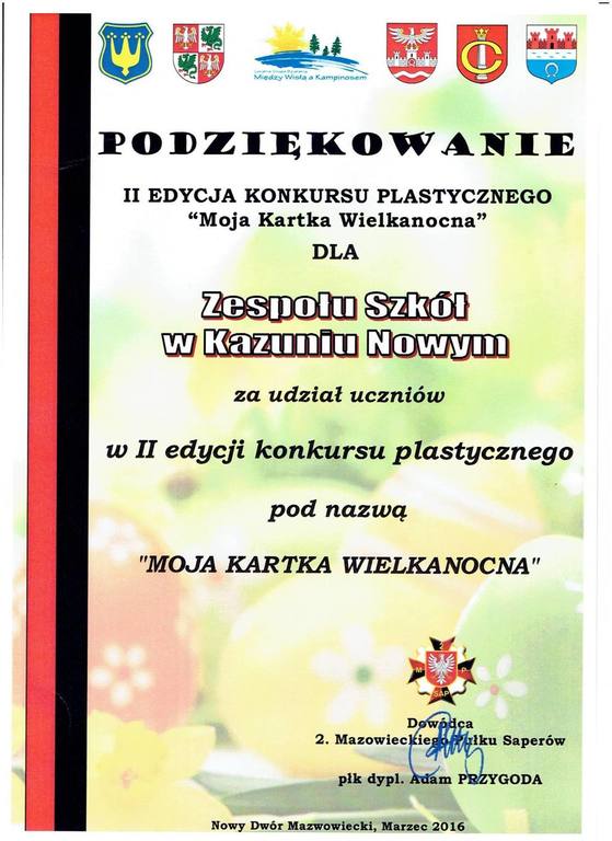6 kwietnia wręczyliśmy nagrody za udział w II edycji konkursu plastycznego "MOJA KARTKA WIELKANOCNA" zorganizowanego przez 2 Mazowiecki Pułk Saperów.