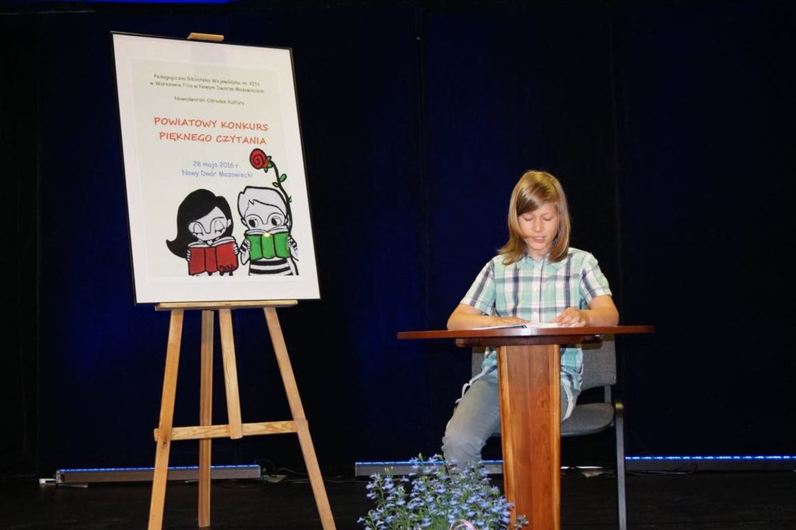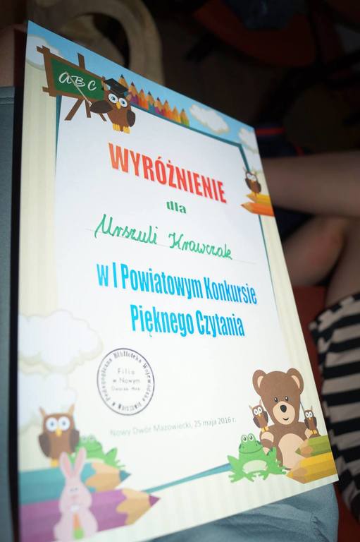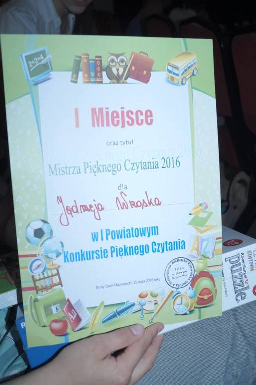 25 maja 2016 r. Basia i Ula Krawczak oraz Jędrek Wrzosek wzięli udział w I Powiatowym Konkursie Pięknego Czytania, który odbył się w Nowodworskim Ośrodku Kultury. 39 uczestników czytało przez 3 minuty wybrany przez siebie fragment ulubionej książki.