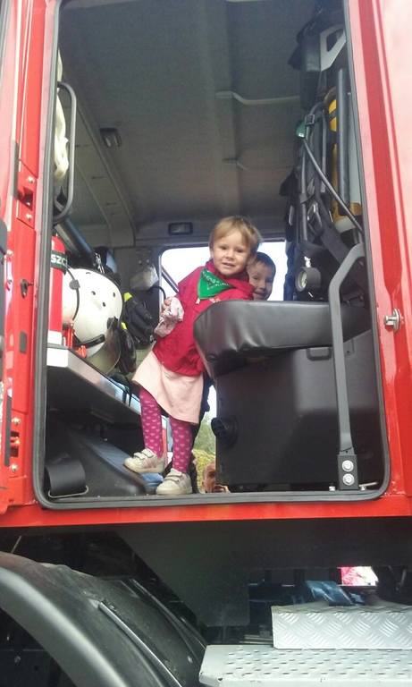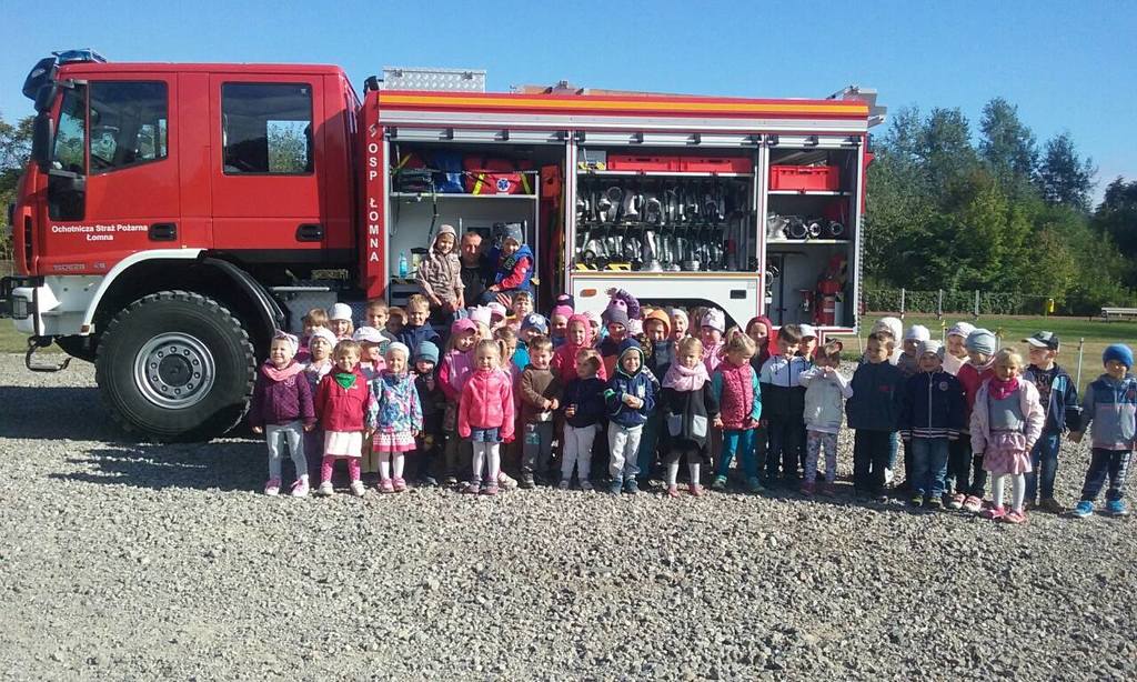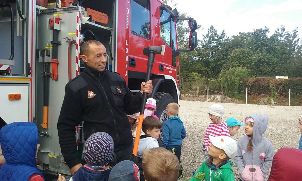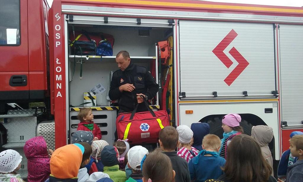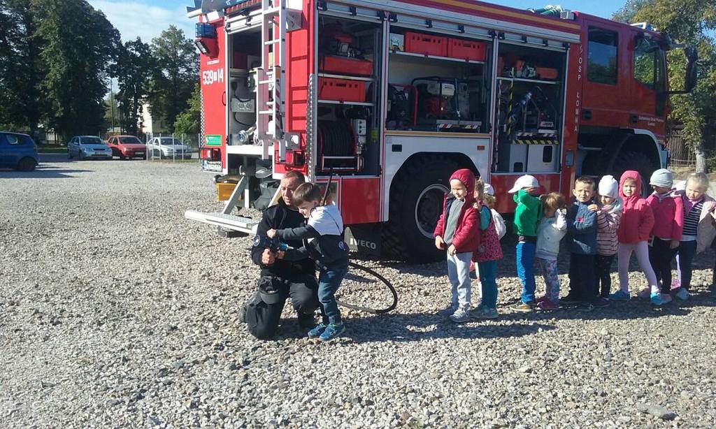21 września do naszego przedszkola przybyli wyjątkowi goście - Strażacy z OSP Łomna. Podczas spotkania, w którym uczestniczyły dzieci ze wszystkich grup przedszkolnych oraz dzieci z klasy 0 strażacy zademonstrowali wykorzystywaną w akcjach aparaturę oraz wyposażenie wozu bojowego, między innymi: gaśnice, węże, sprzęt służący do pomocy podczas wypadków.Komendant opowiedział zebranym dzieciom na czym polega służba w Ochotniczej Straży Pożarnej. Przedszkolaki dowiedziały się także, do czego służy tzw. sygnalizator bezruchu. Ogromną atrakcją okazał się pokaz użycia sprzętu gaśniczego. Pod czujnym okiem, dzieci mogły samodzielnie przekonać się, jak działa prądownica wodna i choć na chwilę "zostać strażakiem" Dziękujemy Komendantowi z OSP Łomna Pawłowi Pawłowskiemu za poświęcony czas i spotkanie z przedszkolakami, które z pewnością na długo pozostanie w pamięci dzieci.