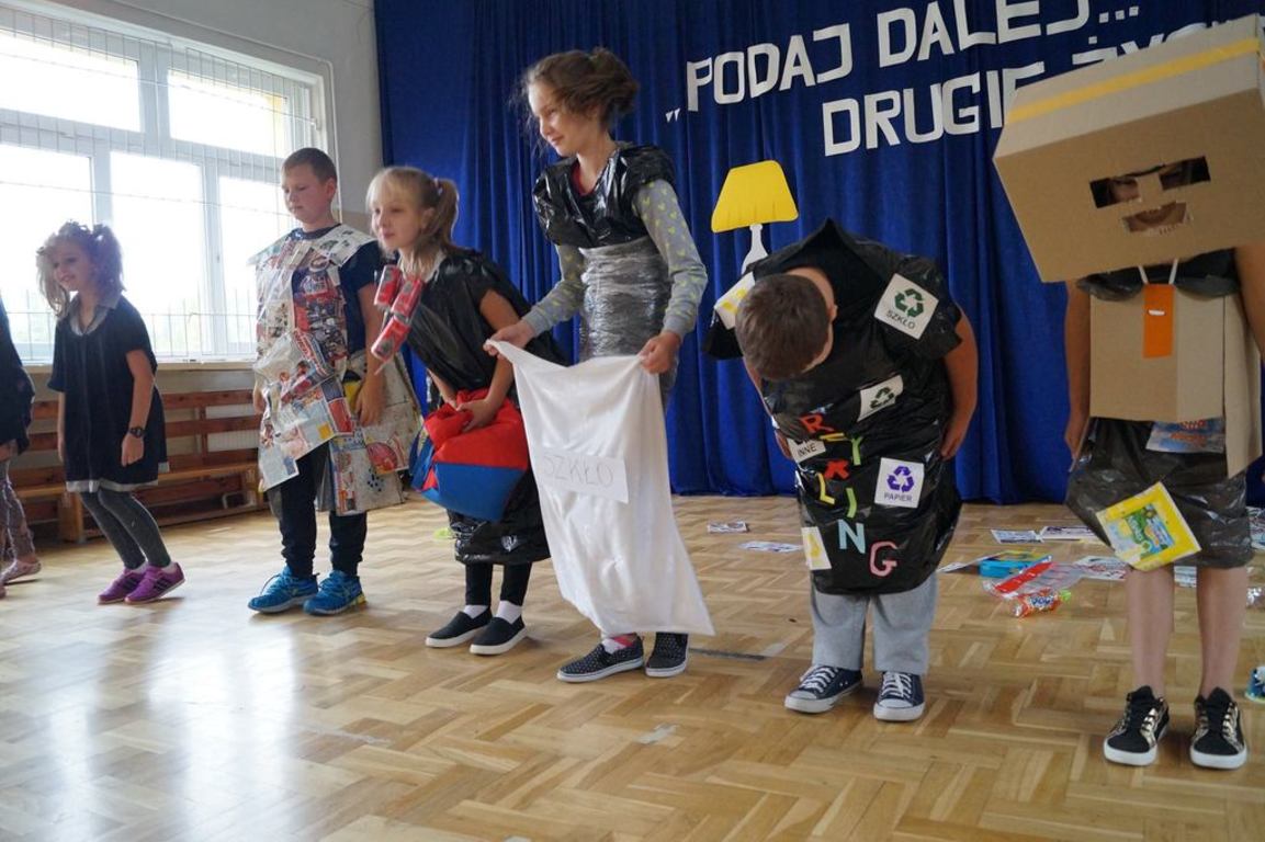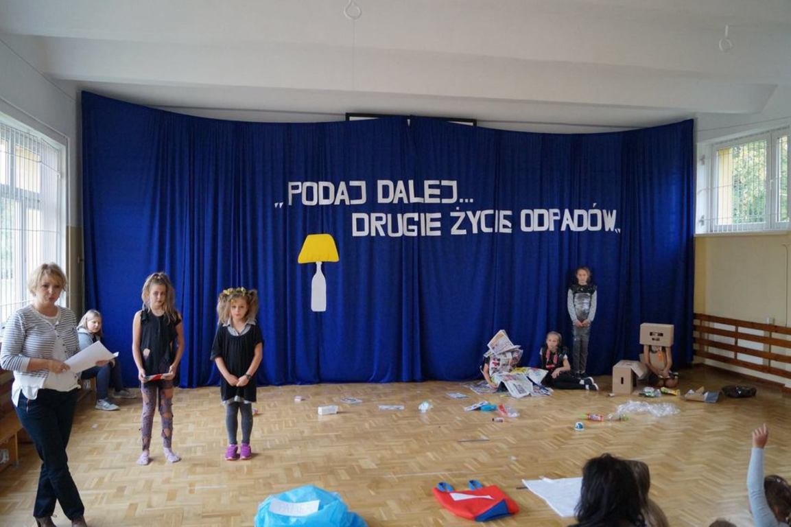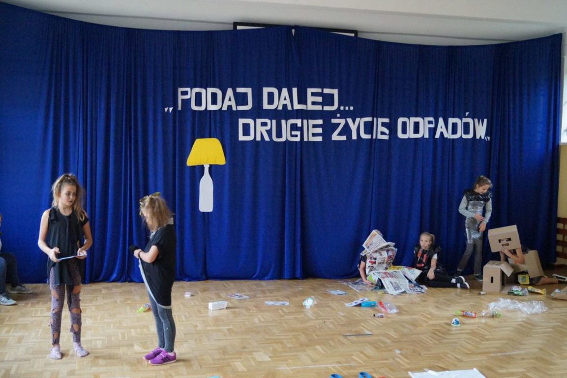 Dnia 23 września nasza społeczność szkolno – przedszkolna uczestniczyła w ekologicznym apelu zorganizowanym z okazji Sprzątania Świata – Polska 2016 pod tegorocznym hasłem „Podaj dalej… Druga szansa odpadów”. Na początku zapoznano wszystkich z genezą i ideą akcji a następnie przedstawiono inscenizację „Rzecz o recyklingu” inspirowaną „Dziadami” Adama Mickiewicza w wykonaniu uczniów klasy V. W ten sposób zwrócono uwagę na poszanowanie zasobów i efektywną segregację, zmniejszanie ilości odpadów poprzez dawanie im „drugiego życia” oraz uświadomienie nam wszystkim, jak dużo wytwarzamy odpadów podczas codziennych czynności. Apel zakończyli przedszkolacy z grupy Pszczółek wykonując piosenkę o tematyce ekologicznej.