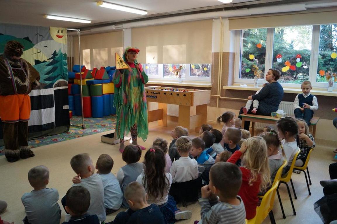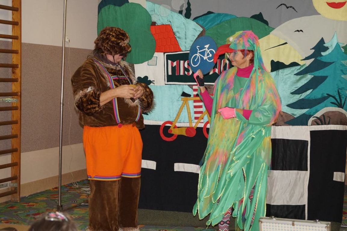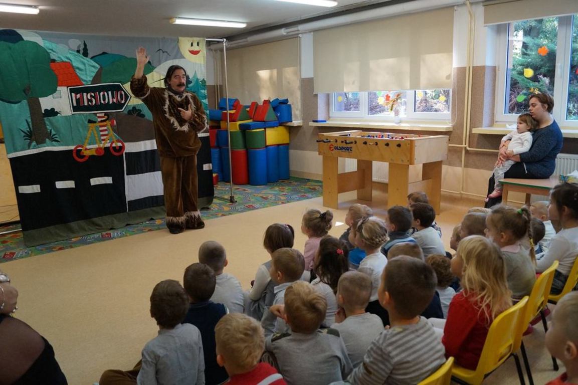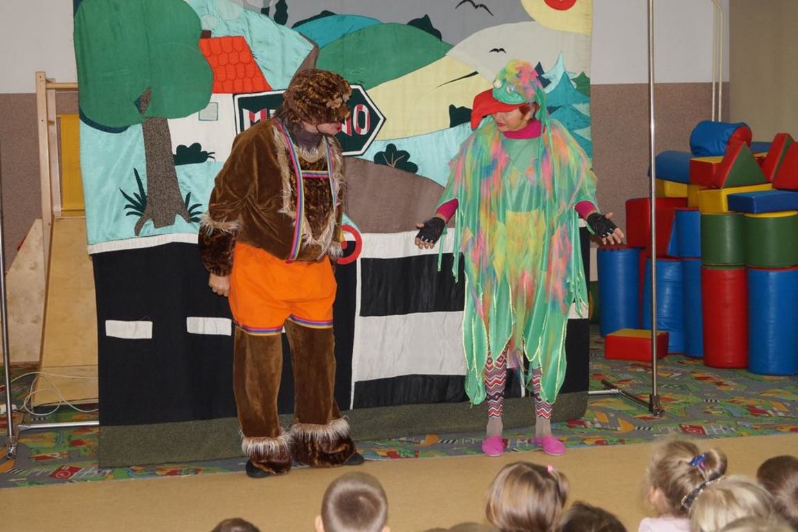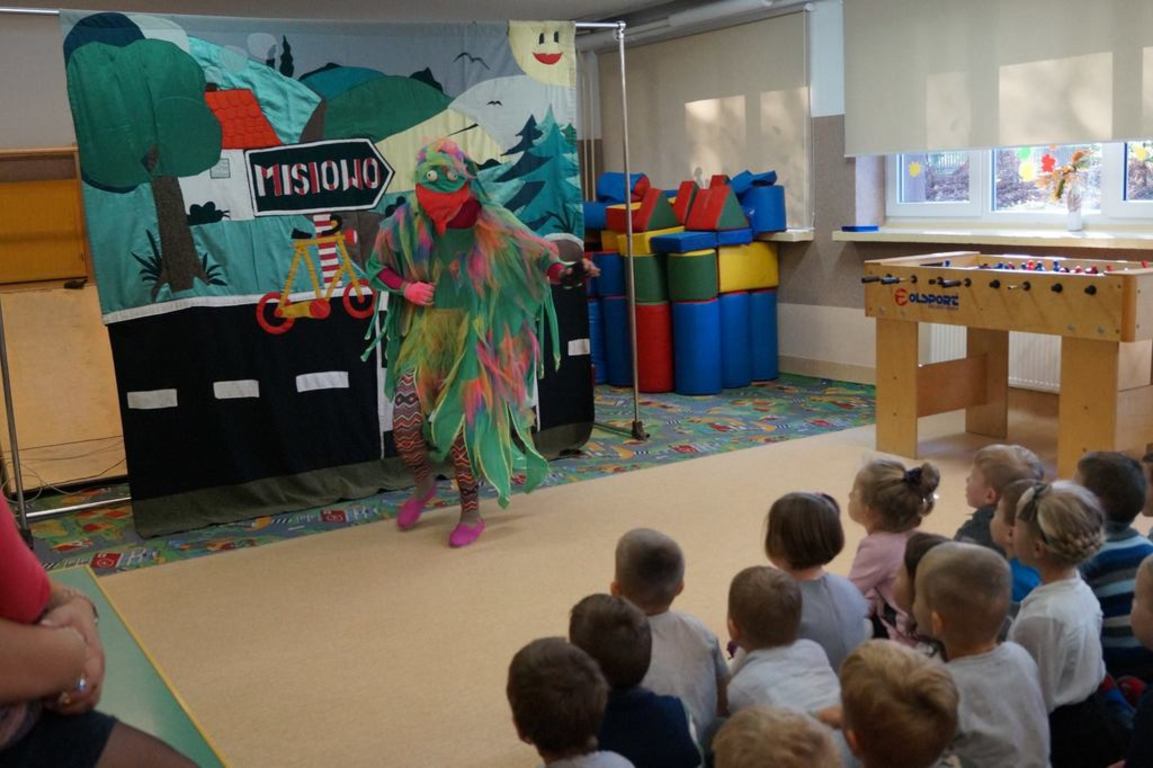 14.10.2016 do naszego przedszkola przybyli artyści z Zespołu Muzycznego KOP z przedstawieniem pt:"Misiowa draka o drogowych znakach". Przedstawienie to opowiadało o sympatycznym misiu, który pragnął nauczyć się jeździć na rowerze, a jego mądra przyjaciółka z lasu, papuga Ara, uświadamiała mu potrzebę poznania znaków drogowych i podstawowych przepisów ruchu drogowego.
