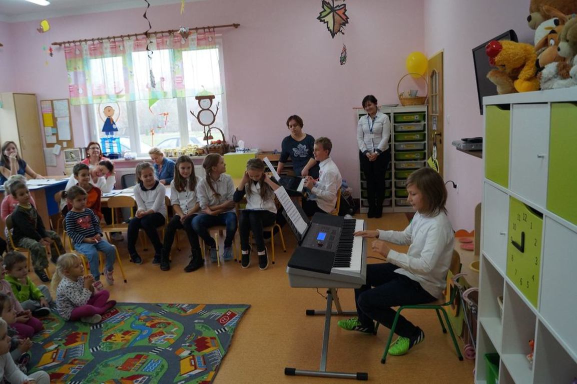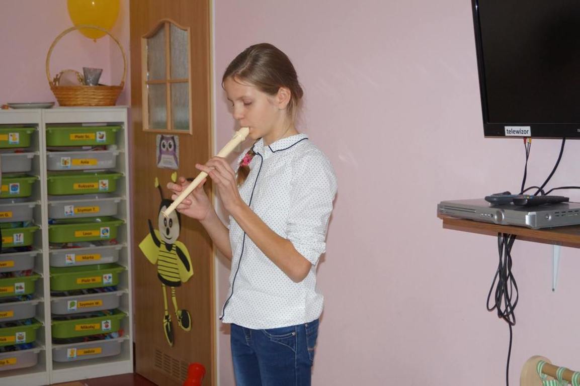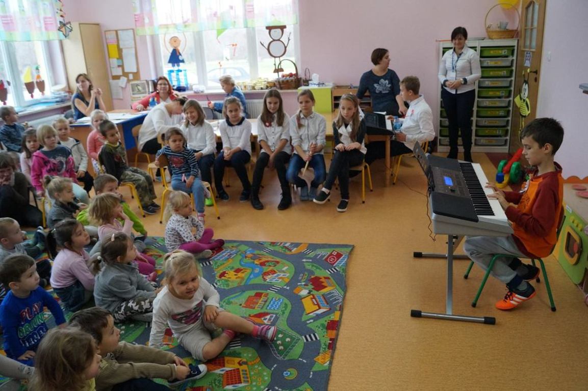 W dniu dzisiejszym uczniowie uzdolnieni muzycznie wybrali się do przedszkola, aby zaprezentować dzieciom zawód muzyka. Na instrumencie klawiszowym przepięknie zagrał Jędrek Wrzosek, jego brat Jeremi Wrzosek zagrał znane utwory na keyboardzie, przepięknie zaśpiewała Alicja Dobrowolska utwór pt. ,, Jagódki", Natalia Floriańczyk zagrała znany przedszkolakom utwór pt. ,, Wlazł kotek na płotek", natomiast Gabriela Stochowska zagrała na flecie. Na koniec koncertu była przygotowana dla dzieci