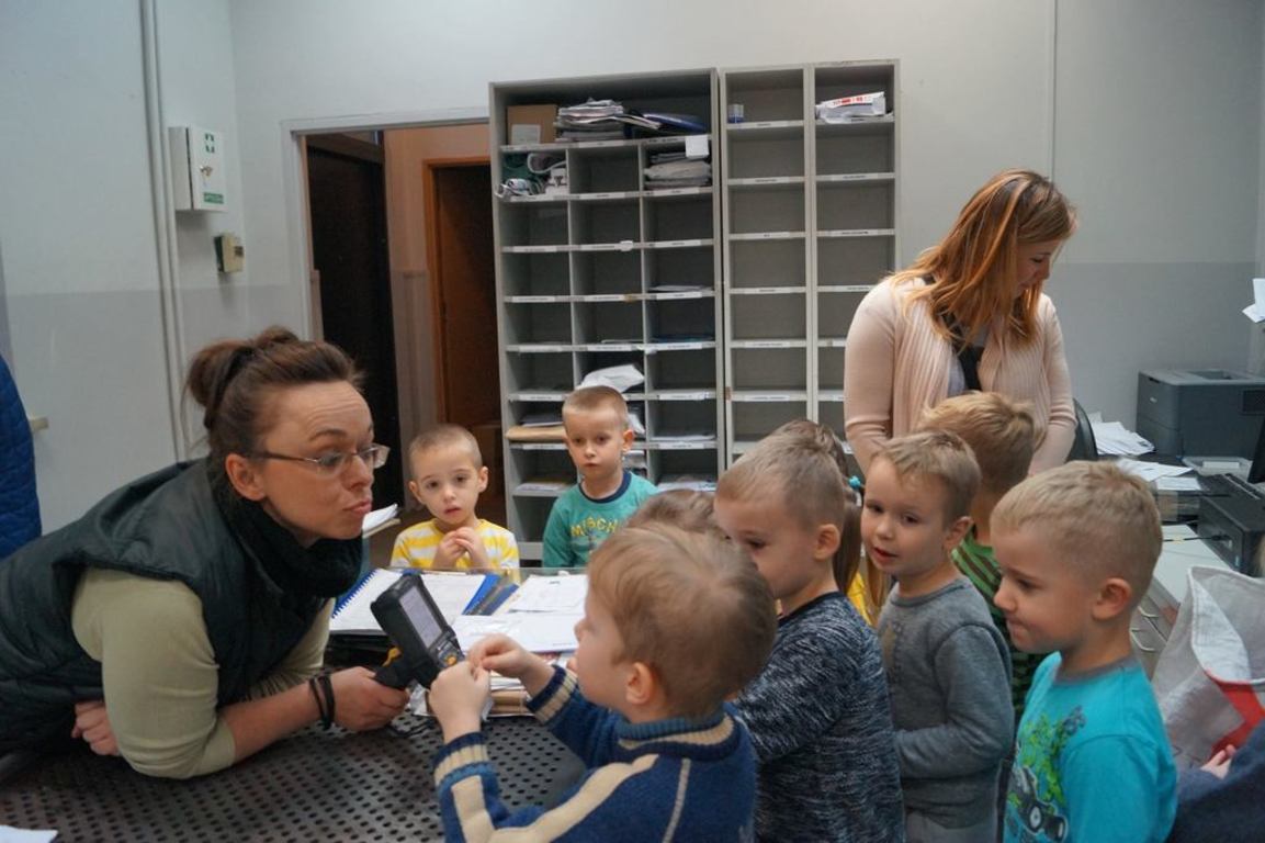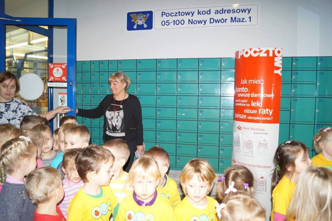 Dnia 30.11.2016r. przedszkolaki z grupy Żabki i Pszczółki odwiedziły Urząd Pocztowy w Nowym Dworze Mazowieckim w celu poznania pracy na poczcie i wyrabiania szacunku do pracy ludzi w różnych zawodach. Dzieci zapoznały się z wyglądem poczty, jej wyposażeniem i urządzeniami: półki na listy i paczki, skrzynki pocztowe, wagi, worki na listy, pieczątki, regały na kartki i czasopisma. Dzieci poznały różne rodzaje listów: zwykłe, polecone, ekspresowe, lotnicze, kartki, telegramy; wzbogaciły słownictwo w zwroty: awizo, przesyłka. Przedszkolaki utrwaliły znajomość swojego nazwiska, imienia, adresu domowego i przedszkola oraz prawidłowego adresowania listów. Pani urzędniczka opowiedziała również dzieciom o trudnej pracy listonosza i innych pracowników poczty. Dzieci miały również możliwość wysłania przygotowanych wcześniej Listów do Świętego Mikołaja.