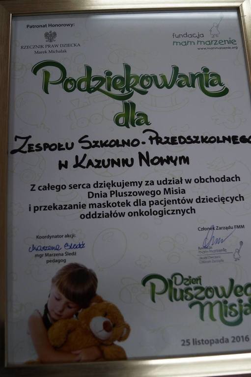 8 grudnia, podczas zebrania z rodzicami, wiceprzewodnicząca Rady Rodziców p. Agnieszka Krzyżak - Karniło wręczyła społeczności szkolnej na ręce dyr. Krystiana Buszty podziękowanie od Fundacji "MAM MARZENIE" za udział w akcji "DZIEŃ PLUSZOWEGO MISIA"