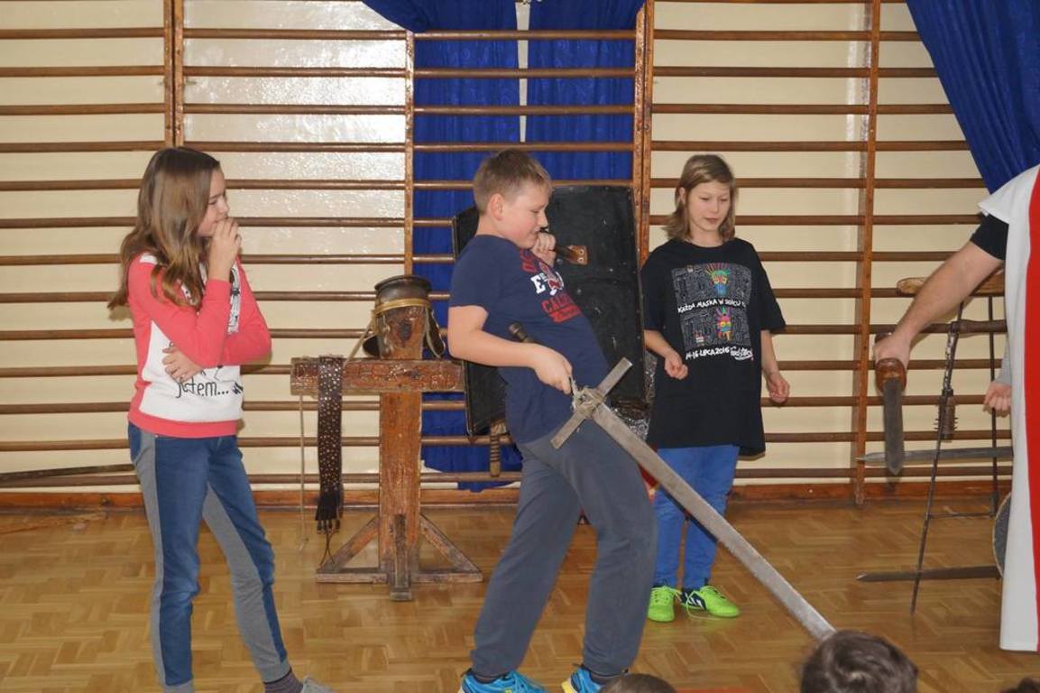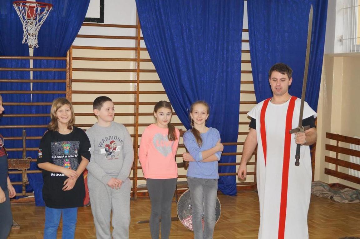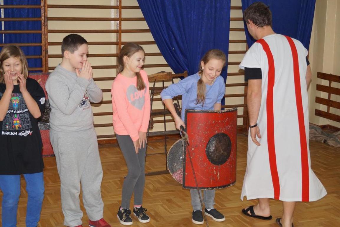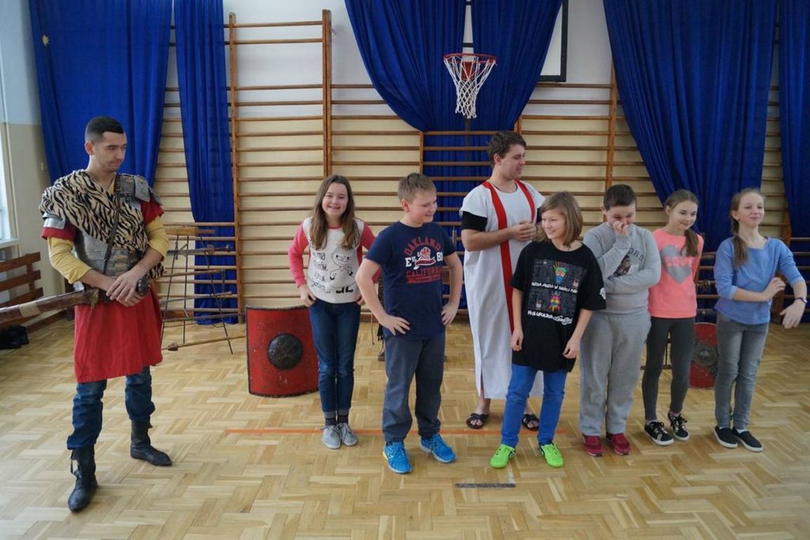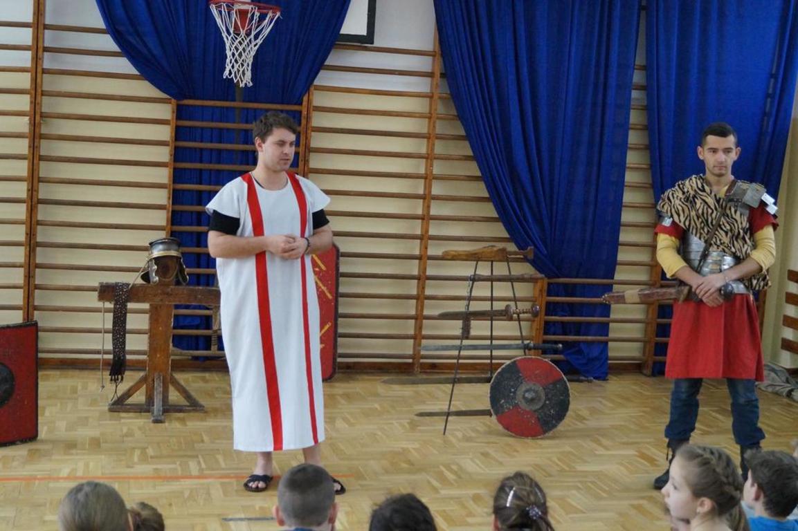 17 stycznia uczniowie z kl. „0” – VI uczestniczyli w żywej lekcji historii, poprowdzonej przez grupę artystyczną „Rekonstrukto”. Tematem zajęć było Rzymskie Imperium i tradycje antyku. Dzieci mogły zapoznać się z kulturą i obyczajami tamtych czasów. Zobaczyć i dotknąć broń z epoki, uczestniczyć w pojedynkach czy nawet stać się niewolnikami. Dużą atrakcją stały się narzędzia tortur prezentowane na pokazie. Kilkoro z naszych uczniów mogło osobiście przekonać się o dotkliwości ówczesnych kar. Cały występ okraszony był anegdotami, co spowodowało, że przebiegał w wesołej atmosferze. Dzięki temu każdy uczestnik mógł w przystępny sposób wiele dowiedzieć się o tamtym okresie w dziejach historii.