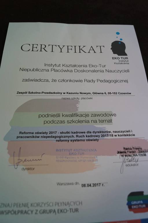 W dniach 7- 9 kwietnia 2017 r.uczestniczyliśmy, jako rada pedagogiczna oraz pracownicy administracji i obsługi, w wyjeździe szkoleniowym do Starych Jabłonek, gdzie pod czujnym okiem trenera prawnika ds oświaty p. Jolanty Fiedeń z firmy EKO -TUR zgłębialiśmy tajniki zbliżającej się wielkimi krokami reformy oświaty. Serdecznie dziękujemy p. Aleksandrze Możejko z EKO - TUR za pomoc w organizacji wyjazdu.