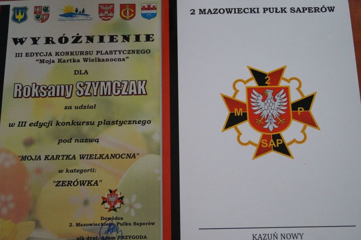 Zakończył się konkurs wielkanocny zorganizowany przez 2 Mazowiecki Pułk Saperów w Kazuniu Nowym pt. "MOJA KARTKA WIELKANOCNA". III MIEJSCE zajął Szymon Graff z Publicznego Przedszkola, a wyróżnienie otrzymała Roksana Szymczak. Nagrody ufundował dowódca 2 Mazowieckiego Pułku Saperów płk. dypl. Adam Przygoda.
