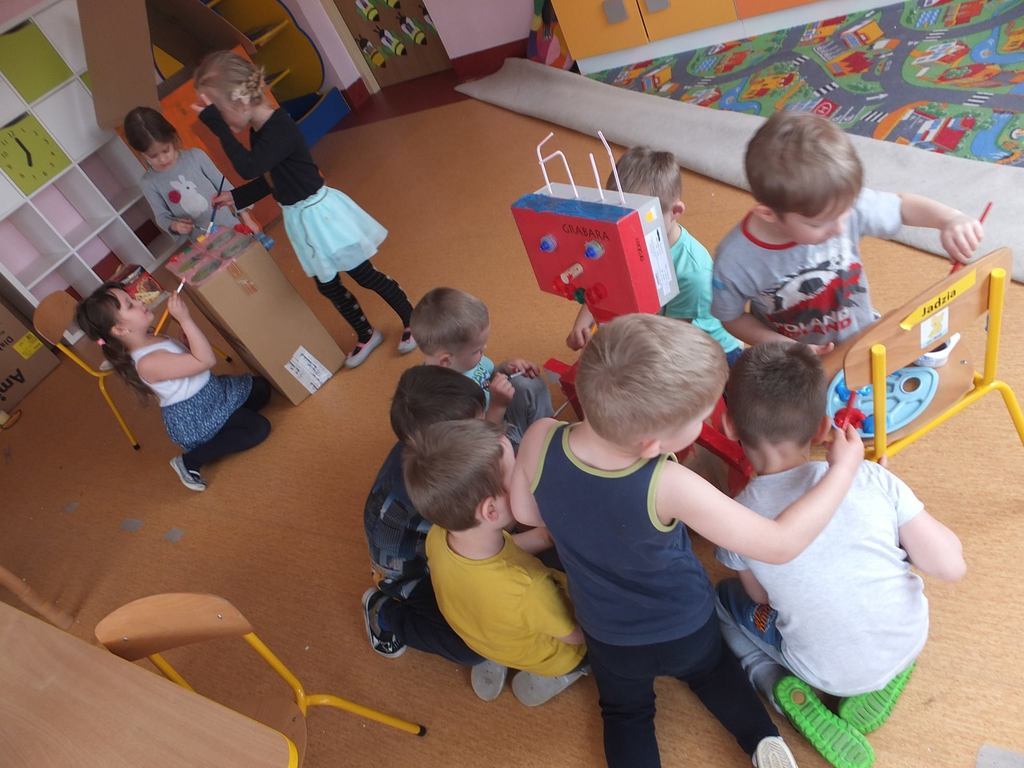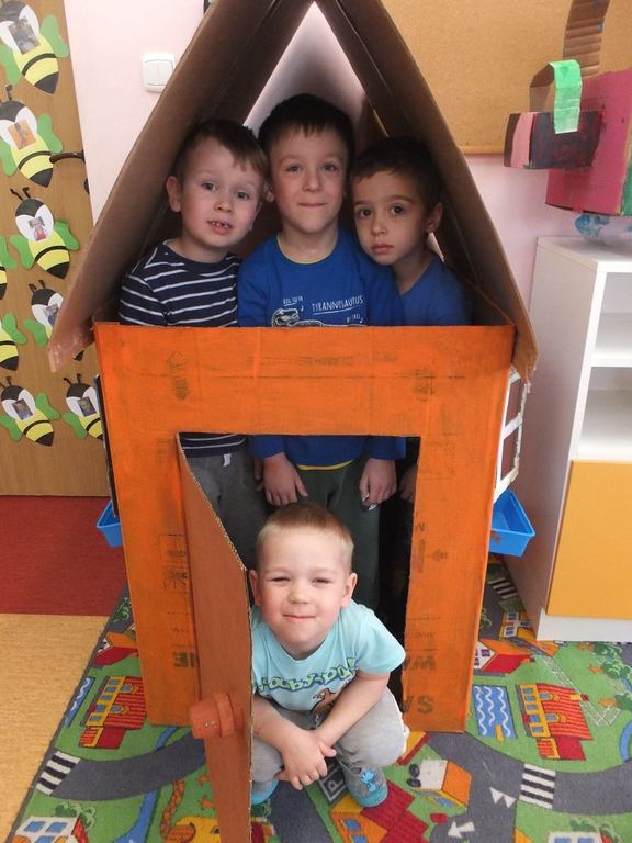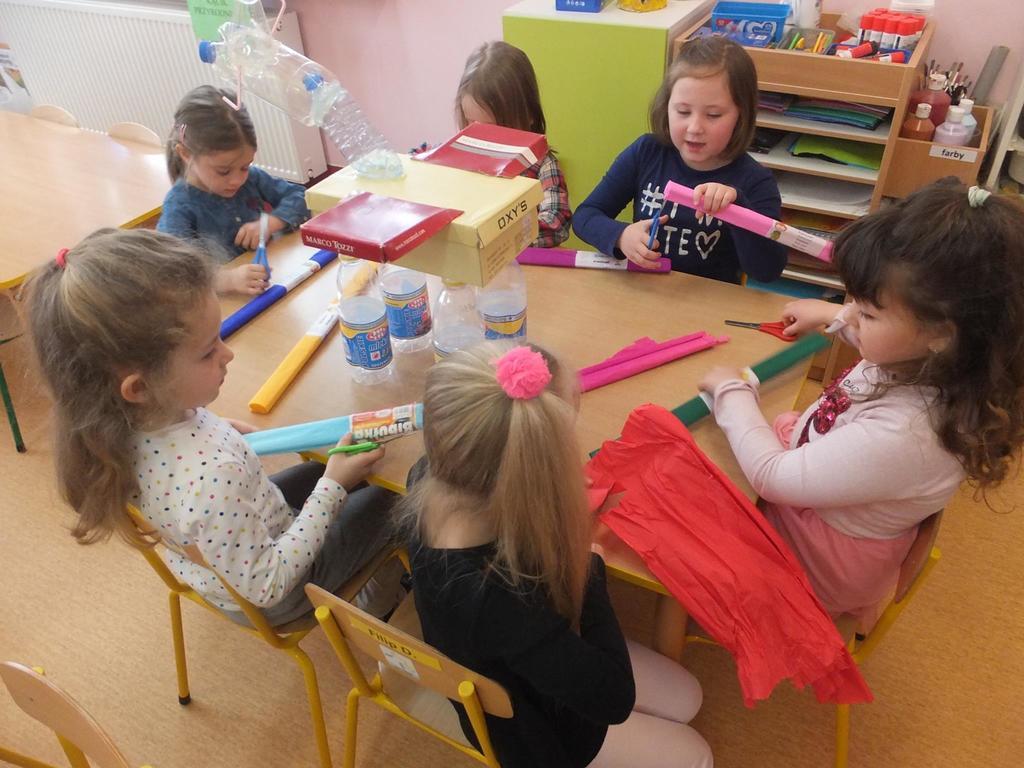 W dniach 24-28 kwietnia w grupie ,,Pszczółki” odbył się ,,Tydzień bez zabawek”. Z półek w sali zniknęły zabawki pozostawiając po sobie puste przestrzenie. Wbrew nazwie dzieci bawiły się jednak zabawkami, ale nie zakupionymi w sklepie, a wykonanymi samodzielnie z przedmiotów przeznaczonych do recyklingu. Puste półki z każdym dniem zaczęły zapełniać się zabawkami - wytworami dzieci.