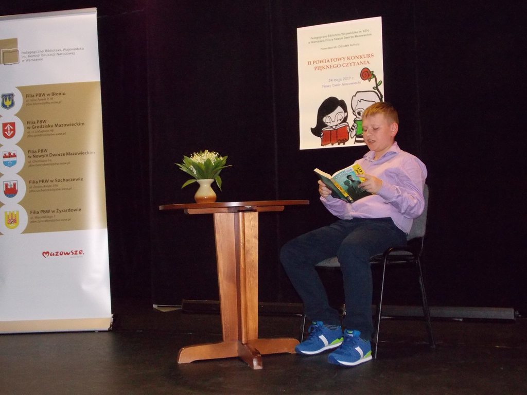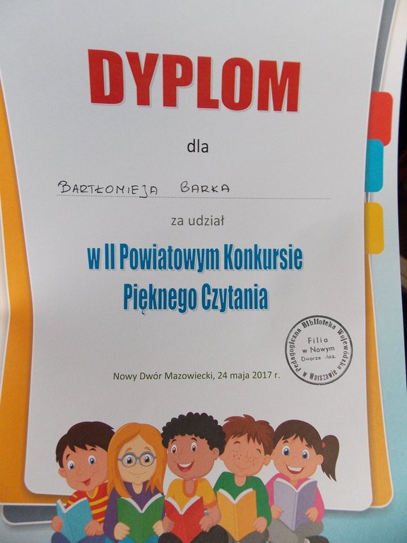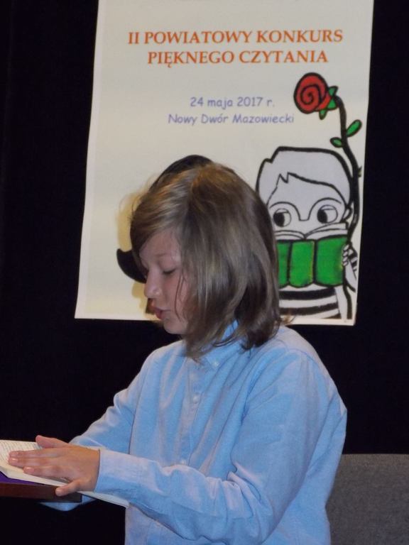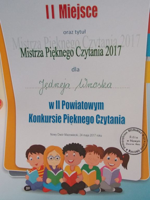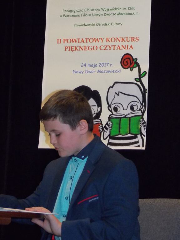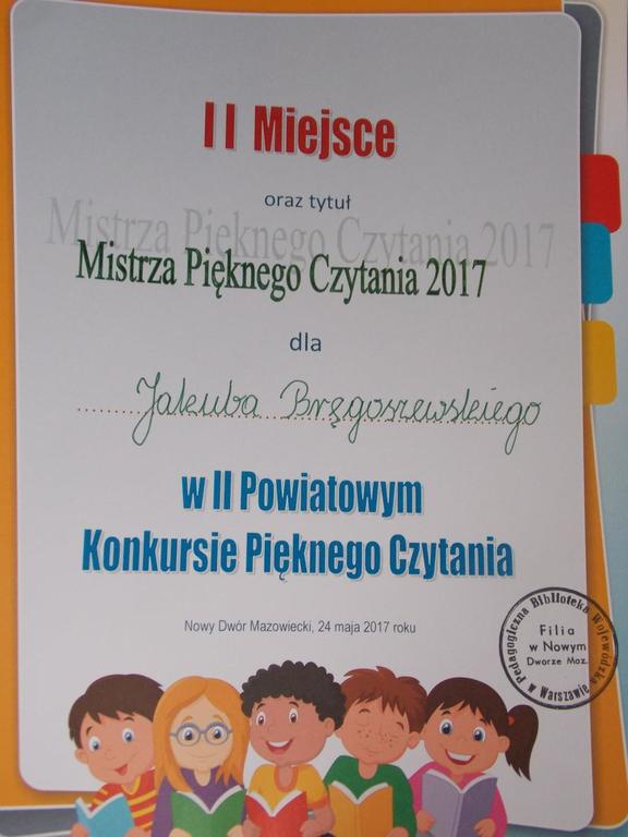 Z ogromną radością informuję, że dnia 24.05.2017r. uczniowie klasy V: Bartek Bark, Jakub Bręgoszewski i Jęrzej Wrzosek godnie reprezentowali nasz zespół w Powiatowym Konkursie Pięknego Czytania w Nowym Dworze Mazowieckim. Mimo ogromnej konkurencji, którą reprezentowało przeszło czterdziestu uczniów z 14 szkół, udało się zdobyć miejsce na podium.