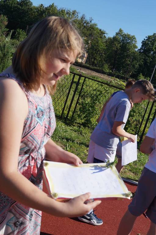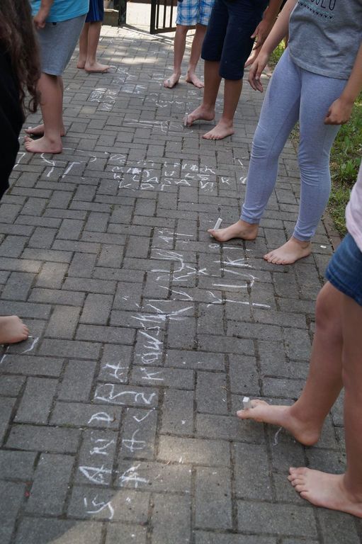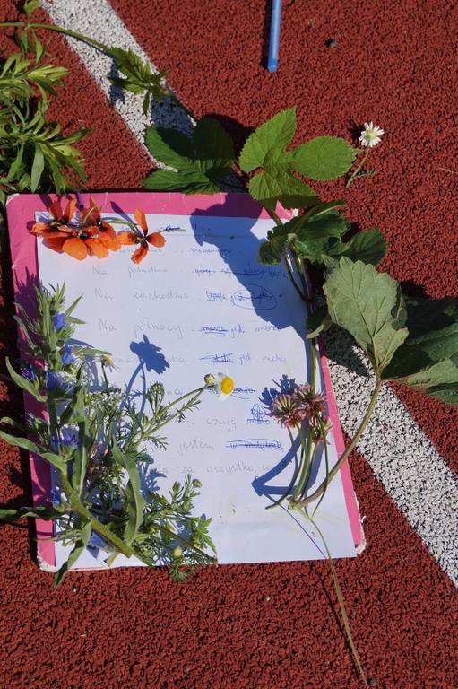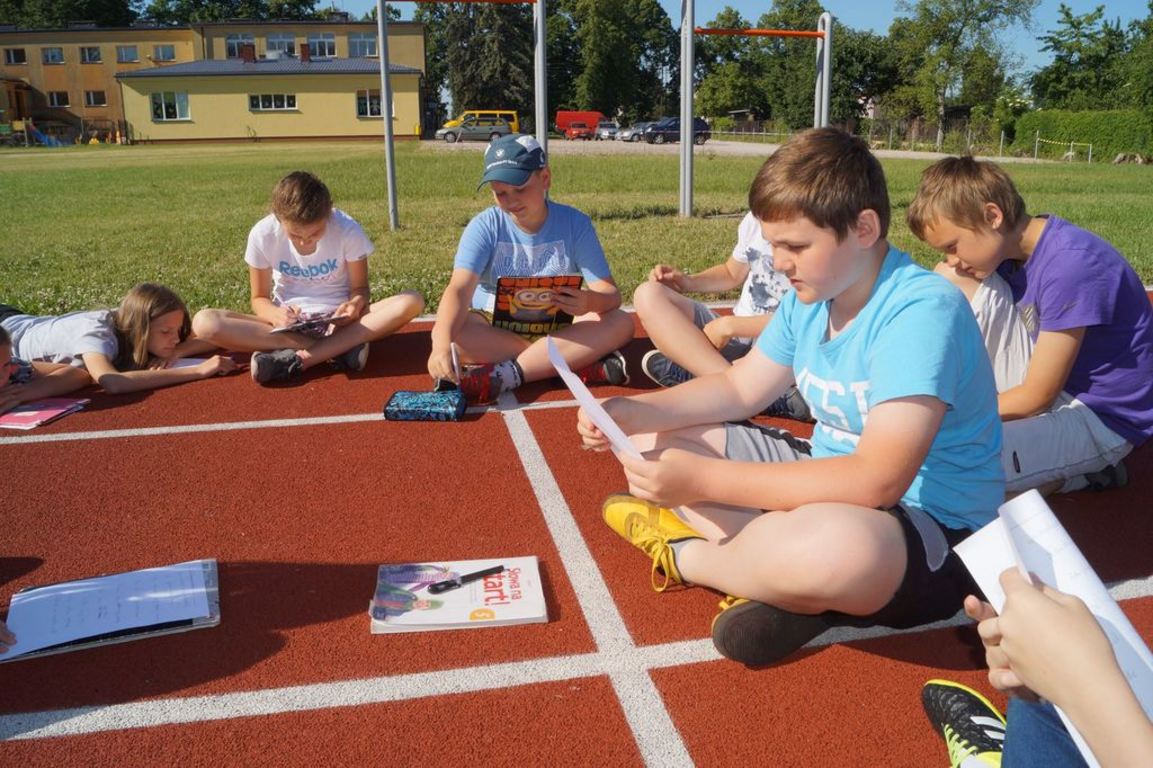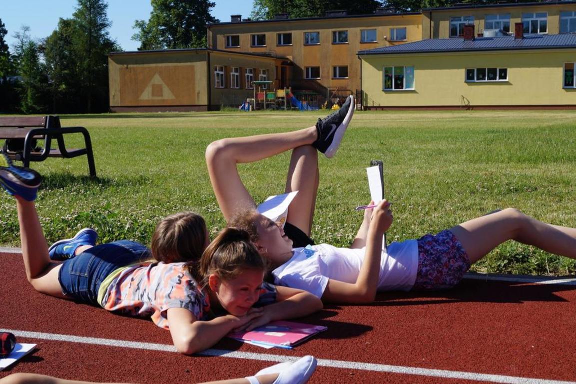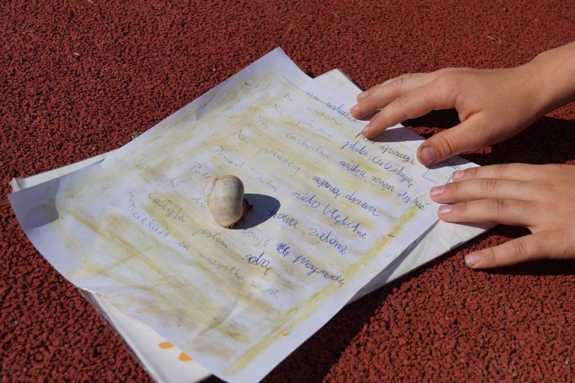 Tak oto uczniowie klasy V i VI pracowali podczas czerwcowych lekcji języka polskiego. Gramatyczny miniturniej na trawie, pisanie kredą gołymi stopami czy tworzenie opisu przy dźwiękach ćwierkających ptaków zaktywizowały uczniów klasy VI i pozwoliły na odkrycie nowych umiejętności. Tworzenie poezji na łonie natury okazało się doskonałym pomysłem. Dzieci wszystkimi zmysłami chłonęły otaczająca przyrodę, aby później stworzyć niepowtarzalne wiersze, jedyne w swoim rodzaju, bo okraszone darami natury.
