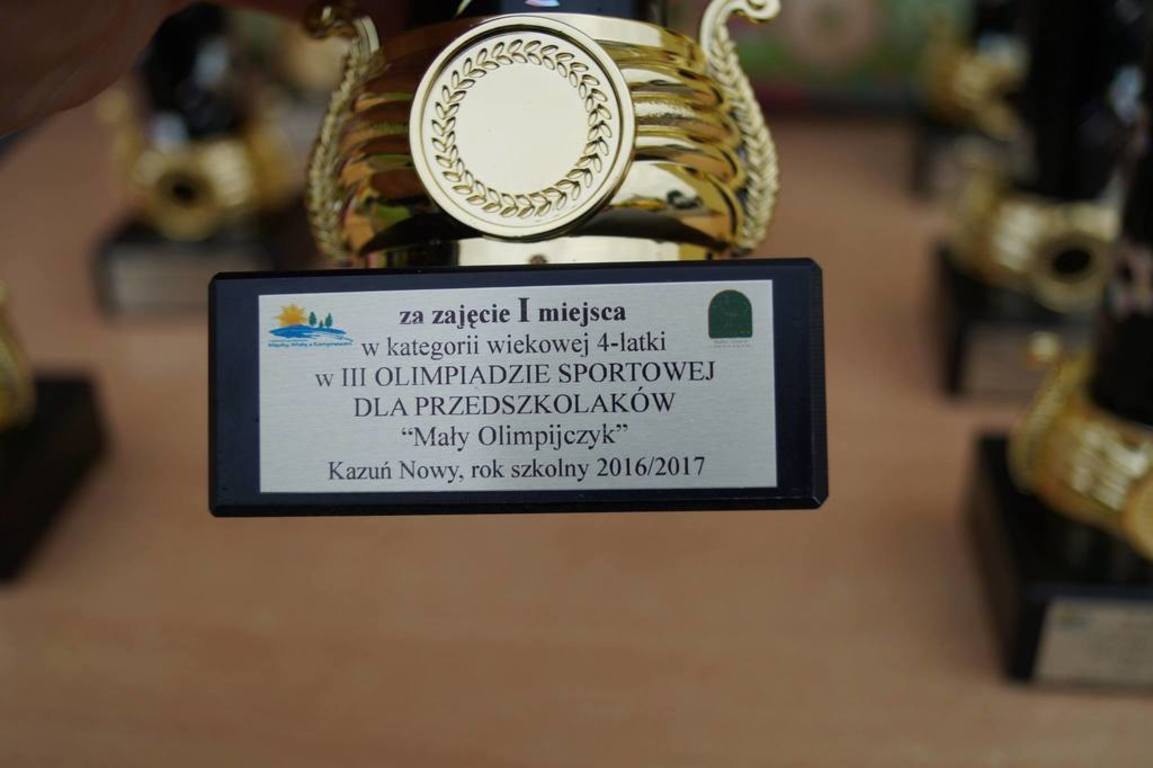 14 czerwca na boisku przy Zespole Szkolno-Przedszkolnym w Kazuniu Nowym odbyła się III Olimpiada Sportowa pod hasłem „Mały Olimpijczyk” dla przedszkolaków z Gminy Czosnów. Tradycyjnie zawody rozpoczął pan Dyrektor Krystian Buszta witając gości i przypominając zasady ,,fair play”. Konkurencje odbywały się w trzech grupach wiekowych, a każdą grupę reprezentowały sześcioosobowe drużyny. Wśród konkurencji były między innymi: rzuty do celu, biegi w workach, biegi z przeszkodami oraz slalomy. Poszczególne zadania wymagały od zawodników szybkości i zwinności. Bardzo ważna była również umiejętność współpracy w zespole. Dzieci radziły sobie świetnie we wszystkich konkurencjach. Nad prawidłowym przebiegiem olimpiady, czuwał zespół sędziowski. Konkurencje sportowe oceniane były w trzech kategoriach wiekowych: 3-latki, 4-latki oraz 5-latki.