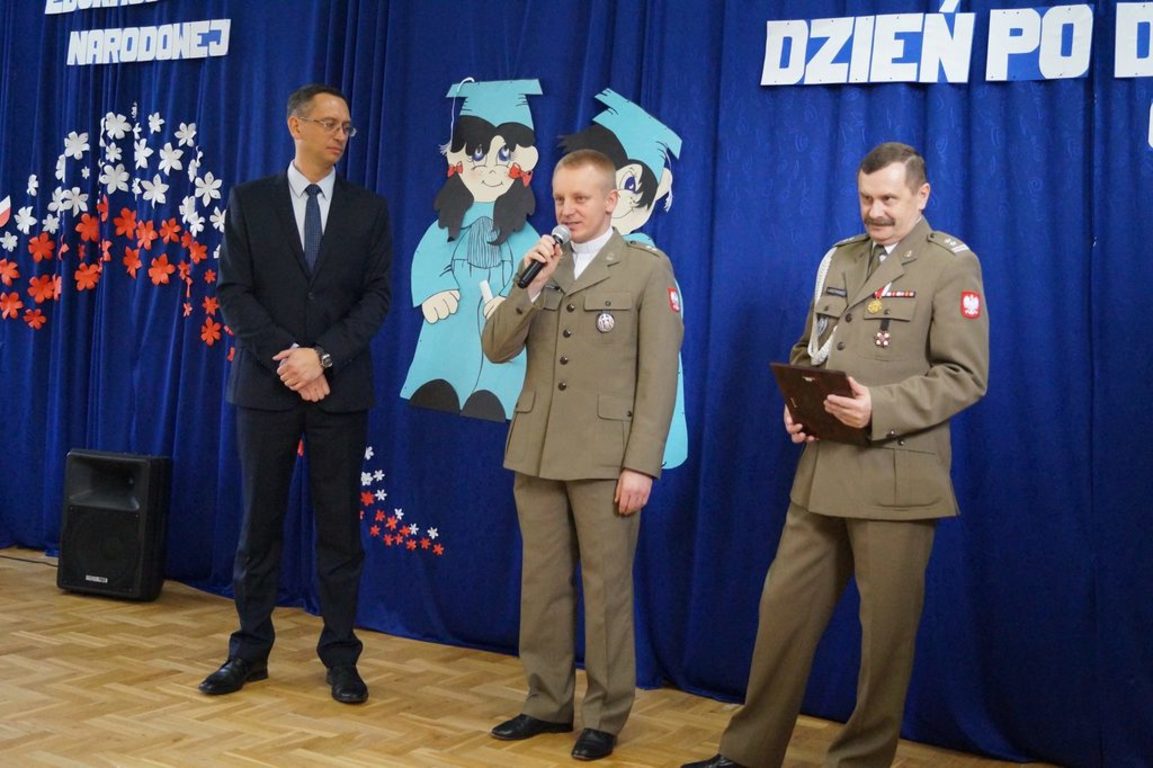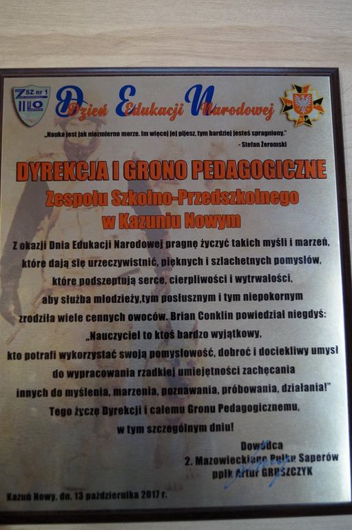 13 października 2017 r obchodziliśmy w szkole podstawowej Dzień Edukacji Narodowej. Na uroczystość przybyli: w imieniu dowódcy - Szef Sztabu 2 Mazowieckiego Pułku Saperów - ppł. Jerzy Łuszczykiewicz, Kapelan 2 Mazowieckiego Pułku Saperów - ks. ppor Mateusz Korpak. Urząd oraz Wójta Gminy Czosnów reprezentowali: p. Katarzyna Grabska - Gliwka - Kierownik Wydziału Oświaty, Kultury i Promocji oraz p. Marek Zielski - wiceprzewodniczący Rady Gminy Czosnów. Radę Rodziców reprezentowała przewodnicząca p. Renata Tyszka.