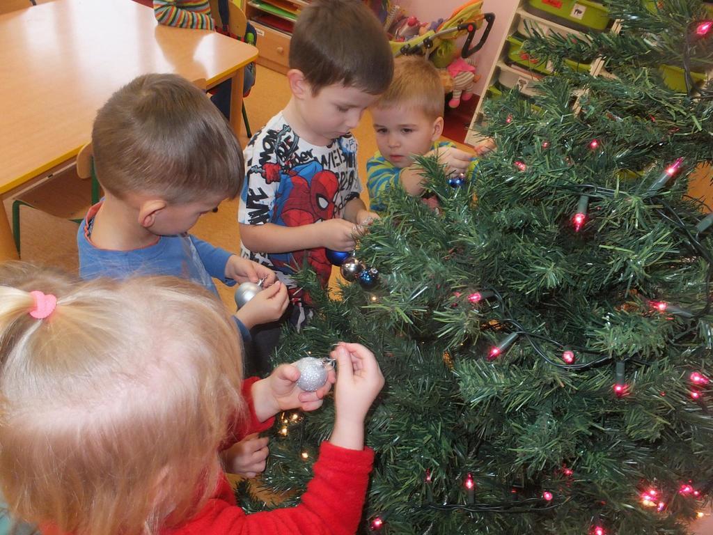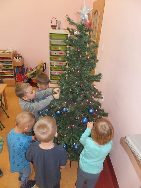 Ubieranie choinki to jedna z najpiękniejszych tradycji świątecznych. Trudno wyobrazić sobie Boże Narodzenie bez choinki . W naszym przedszkolu również nie mogło zabraknąć tego rytuału. Tuż przed wizytą św. Mikołaja długo oczekiwanego gościa przedszkolaki z wielkim zapałem zabrały się do ubierania choinki. Zawieszały bombki, gwiazdki i łańcuchy. Choinka wygląda prześlicznie. Jak co roku udekorowaliśmy korytarz przedszkolny dekoracjami świątecznymi. Ileż było radości wśród dzieci i rodziców, a w przedszkolu od razu zrobiło się świątecznie i bajkowo.