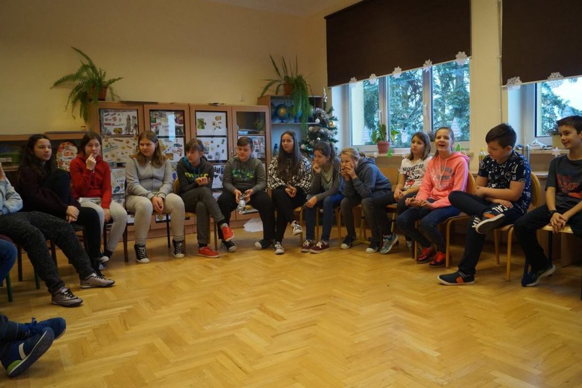 Uczniowie klas 5, 6 i 7 uczestniczyli w warsztatach profilaktycznych, które prowadziła pani Iwona Figurska, terapeuta uzależnień i współuzależnień. Dzieci dowiedziały się o zagrożeniach, jakie wypływają z zawierania wirtualnych znajomości, opowiadały także o swoich własnych doświadczeniach w tym temacie. Ponadto terapeutka uświadomiła uczniów kiedy korzystanie