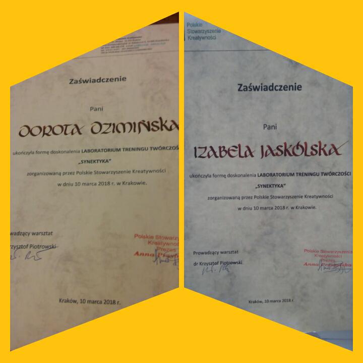Nauczyciele naszego zespołu dbają o nieustanny rozwój i podnoszenie swoich kwalifikacji. Dnia 10 marca 2018r. p.Dorota Dzimińska i p. Izabela Jaskólska uczestniczyły w Laboratorium Treningu Twórczości Polskiego Stowarzyszenia Kreatywności, które odbyło się w OTE KANGUR w Krakowie. LTT PSK to cykliczne warsztaty metodyczne służące wymianie i bogaceniu doświadczeń w obszarze metodyki twórczego rozwiązywania problemów, nie tylko edukacyjnych. Tym razem uczestnicy poznawali tajniki twórczego rozwiązywania problemów metodą synektyczną, którą przybliżył prowadzący p. dr Krzysztof Piotrowski, psycholog z Uniwersytetu Jagiellońskiego.