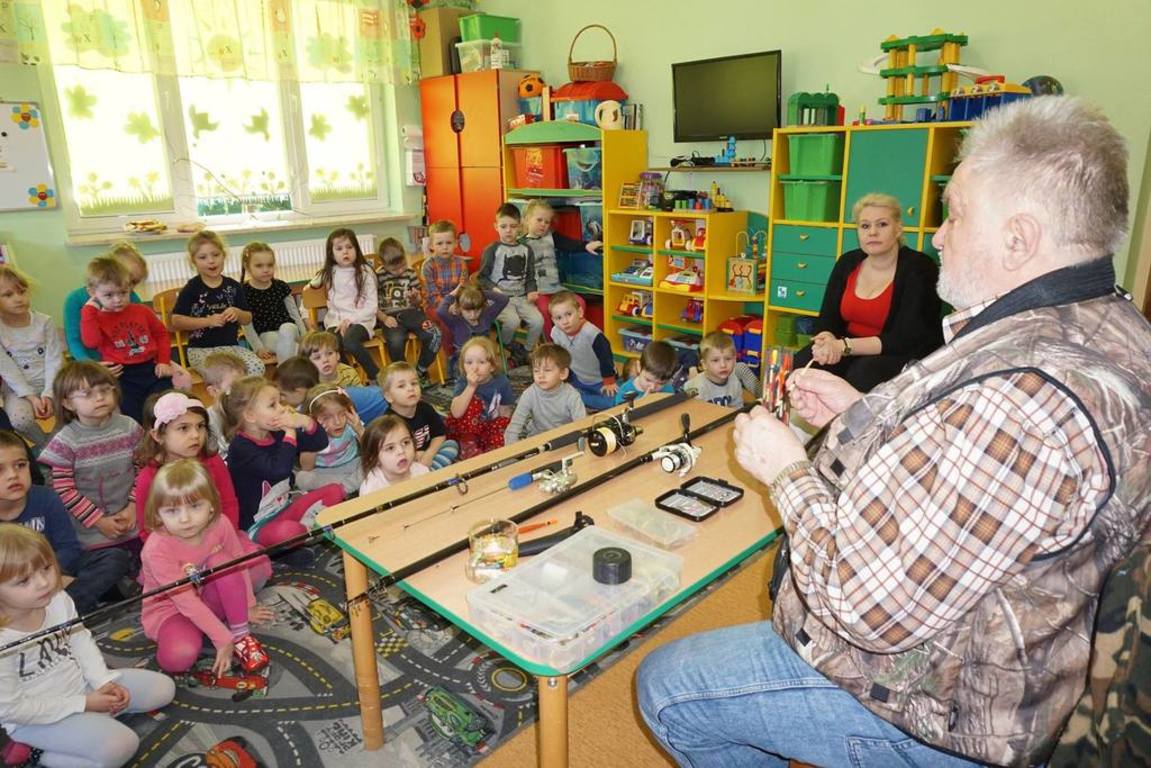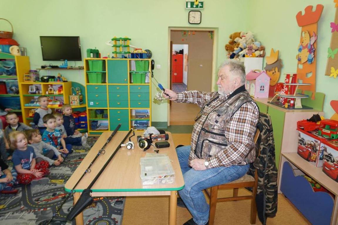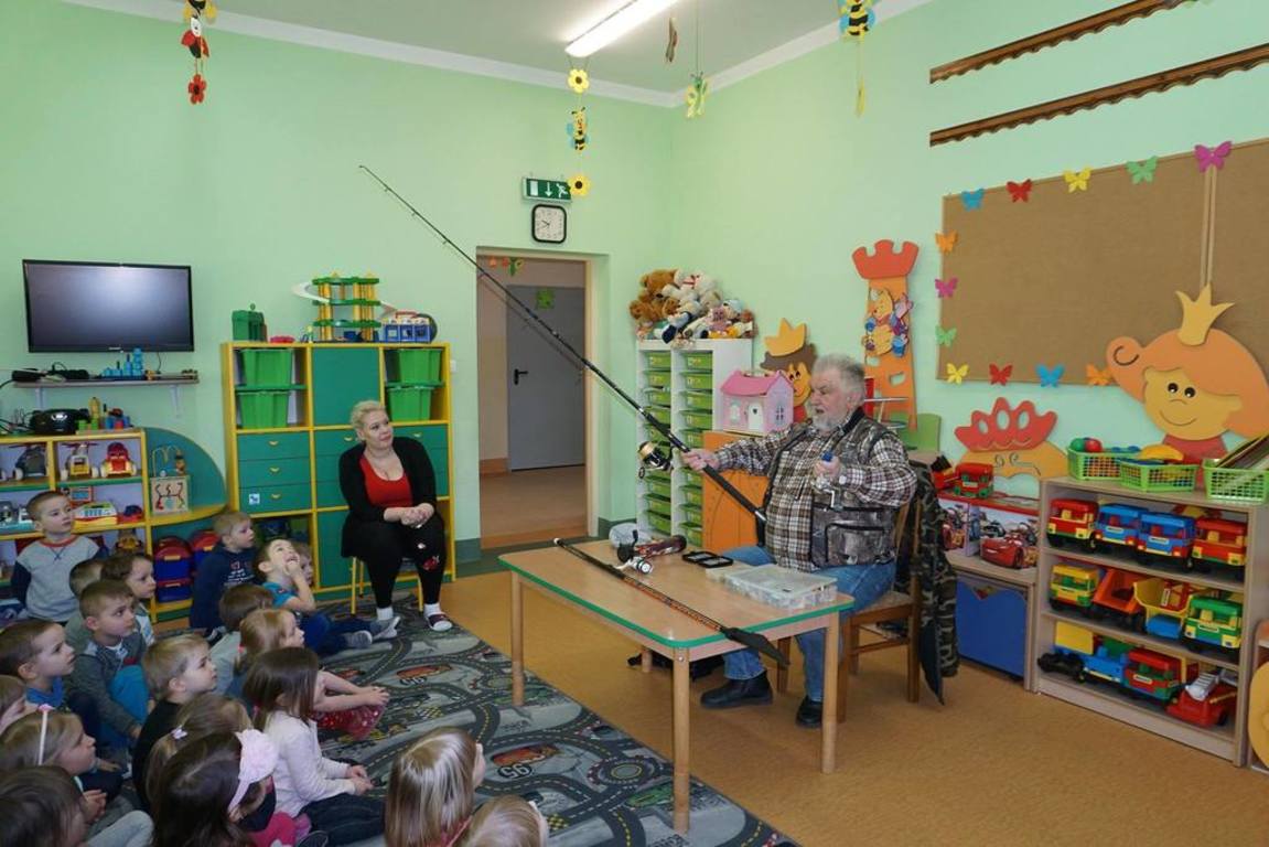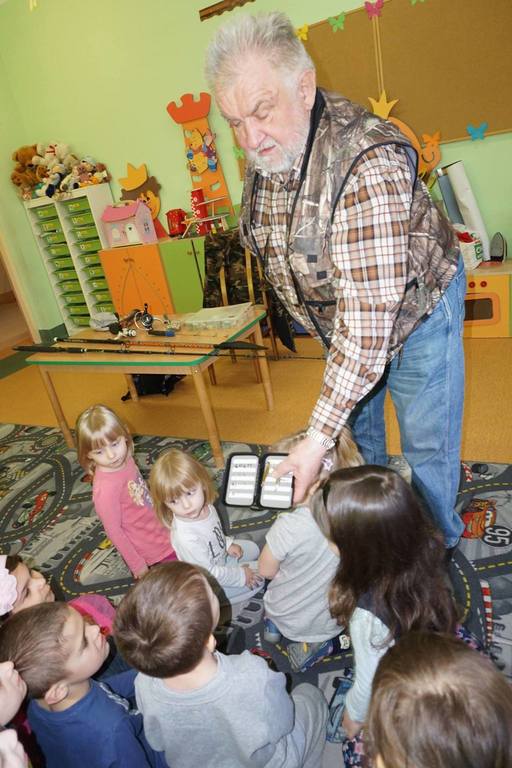 19 marca nasze przedszkole z okazji Dnia Wędkarza odwiedził pan Jerzy Łukasik prywatnie Dziadek Zuzi z Pszczółek i Olusia z Biedronek. Prezes Koła PZW nr 49 w Kazuniu Nowym zapoznał dzieci z całym ekwipunkiem wędkarza oraz opowiedział o różnych rodzajach ryb. Były wędki krótkie i długie. Były sztuczne przynęty oraz spławiki. Poznaliśmy zasady działania kołowrotka, żyłki i przelotek na szczytówce. Omówiliśmy zasady połowu ryb w naszym kraju oraz zasady bezpiecznego zachowania się nad wodą. Dzieci z zainteresowaniem oglądały przyniesione przez wędkarza rzeczy jednak największą frajdę sprawiły im wszelki gumki, wobblery, muszki i inne kolorowe gadżety. Dziękujemy serdecznie Dziadkowi Jerzemu za przyjęcie naszego zaproszenia i odwiedzenie naszych przedszkolaków.