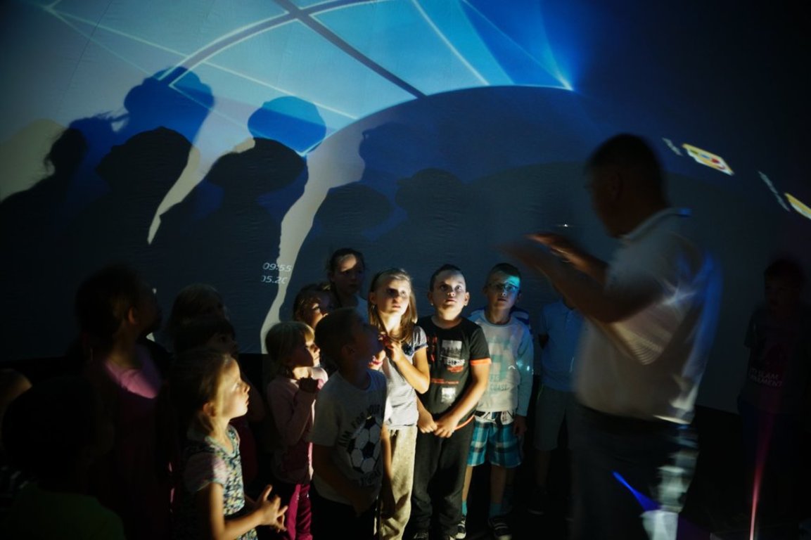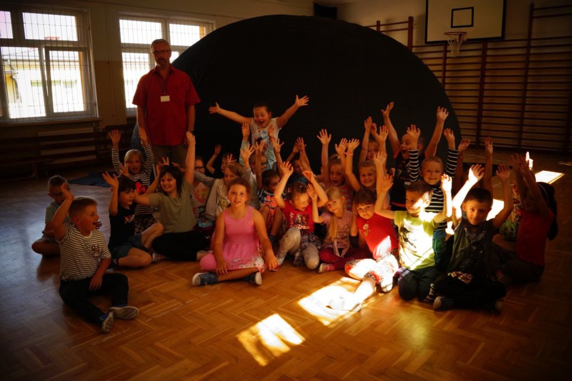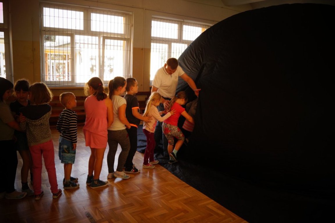 W piątek 25 maja odwiedziło naszą szkołę mobilne planetarium i uczniowie klas 0,I,II mogli wziąć udział w podróży w kosmos. Wielki, czarny balon który został rozstawiony na sali gimnastyczne imitował niebo, a dzieciaki siedzące w balonie-namiocie czuły się jak pod prawdziwym sklepieniem pełnym gwiazd, planet i innych obiektów kosmicznych. Przypomnieliśmy sobie nazwy wszystkich planet naszego układu słonecznego , a lądując rakietą na każdej z nich, poznawaliśmy ich charakterystyczne cechy i właściwości. Lektor pięknie i ciekawie opowiadał o drodze mlecznej, asteroidach i gwiazdach. Dzieci z ciekawością wysłuchały opowieści o kosmosie i przez chwilę mogliśmy pobyć bliżej gwiazd. Bardzo podobała nam się ta kosmiczna podróż, aż trudno było z powrotem wracać na Ziemię, chociaż wszyscy zgodnie stwierdziliśmy, że nasza planeta jest jednak najpiękniejszą ze wszystkich planet układu słonecznego.