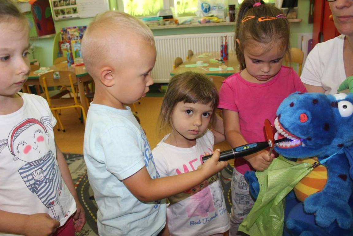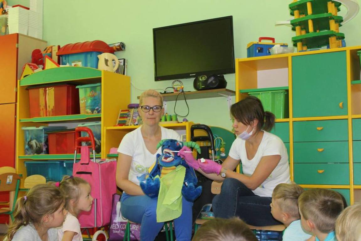 Panie higienistki stomatologiczne na początku zajęć przedstawiły się i wyjaśniły jaki jest cel ich wizyty. Omówiły produkty, mające wpływ na stan uzębienia , rozróżnianie zdrowych oraz niezdrowych produktów, a także poznanie nawyków zmniejszających ryzyko wystąpienia próchnicy. Dzieci zostały zapoznane z podstawowymi narzędziami spotykanymi podczas wizyty w gabinecie stomatologicznym. Dowiedziały się jakie zabiegi są wykonywane w gabinecie u dentysty. Podczas całego spotkania towarzyszył dzieciom Smok Bartek z dużymi i okazałymi zębami 🙂 to właśnie na nim zaprezentowano metody szczotkowania zębów za pomocą dostępnych na rynku szczoteczek. W dalej części warsztatów każde dziecko otrzymało maskę ochronną oraz model szczęki- samodzielnie próbowały szczotkować zęby. Ćwiczenie miało na celu przyswajanie prawidłowej techniki szczotkowania oraz wyrabianie nawyków mycia zębów przez określony czas. Po tych ćwiczeniach każde dziecko przystąpiło do zakładania plomby na chorego ząbka.