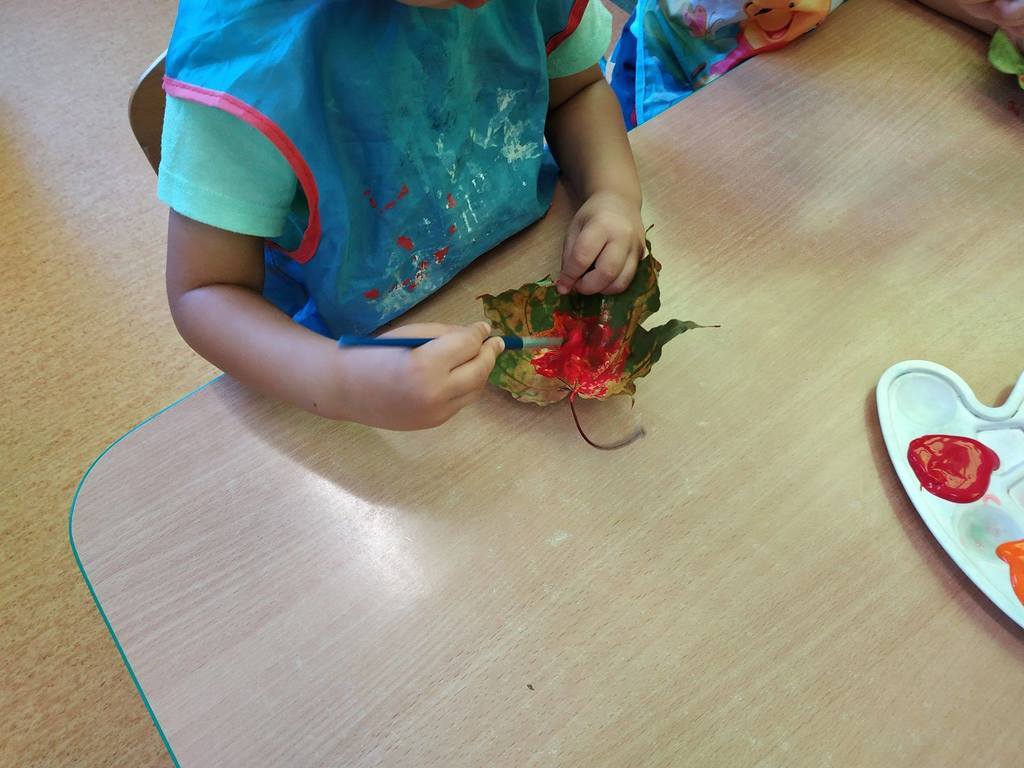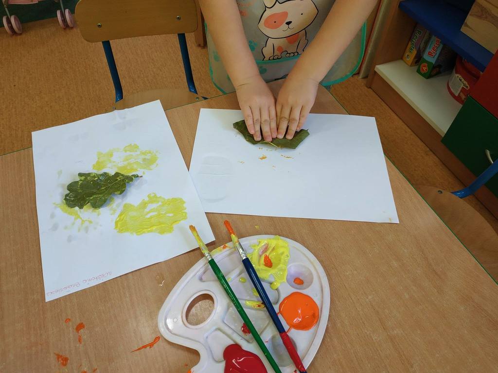 Odbijanie liści za pomocą farby plakatowej oraz pędzla jest bardzo przyjemną twórczością zarówno dla przedszkolaków jak i starszych dzieci. Do zabawy przedszkolaki potrzebowały niewiele, a radości było mnóstwo.