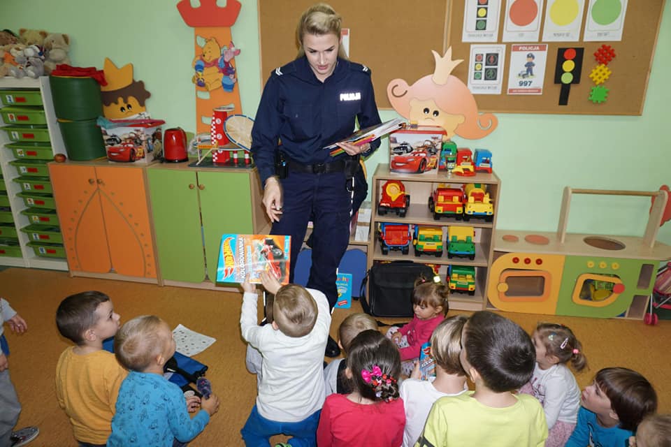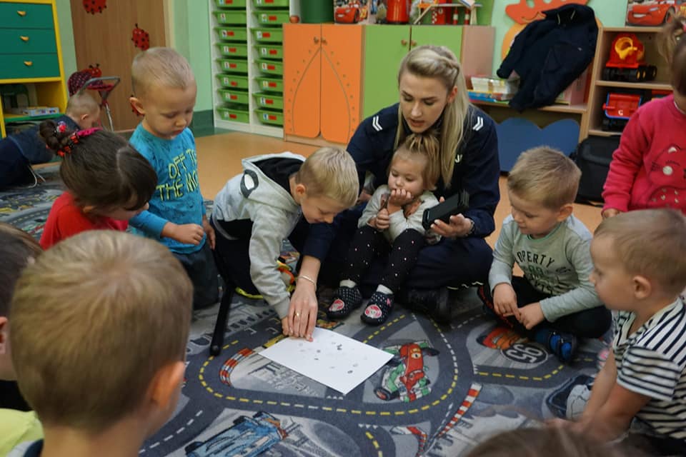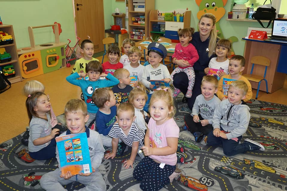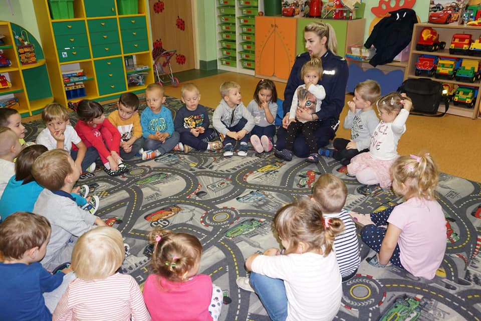 W ramach naszych bezpiecznych zajęć 30 października przybyła również starsza sierżant Sylwia Ochmańska z Komendy Powiatowej Policji w Nowym Dworze Mazowieckim. Pani sierżant opowiedziała dzieciom o ważnej i odpowiedzialnej pracy policjanta. Dzięki prezentacji multimedialnej i spotkaniu z policjantem Polim dzieci utrwaliły sobie jakie są zasady uczestnictwa w ruchu drogowym poznały różne niebezpieczne sytuacje, które mogą zagrażać małemu dziecku i zasady zachowania się w nich. Przedszkolaki mogły też zobaczyć, jak wygląda strój policjantki, i jakie ciekawe przedmioty skrywał policyjny worek. Na zakończenie spotkania przedszkolaki otrzymały pamiątkowy upominek.
