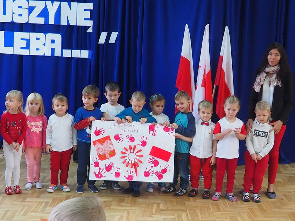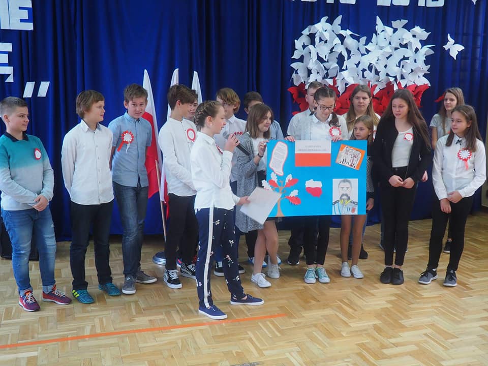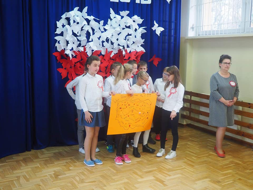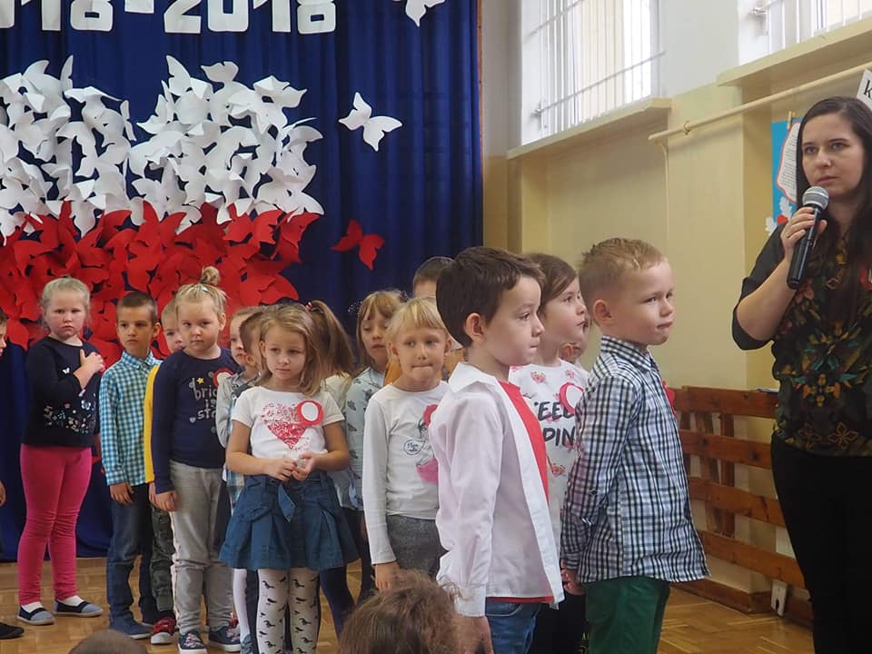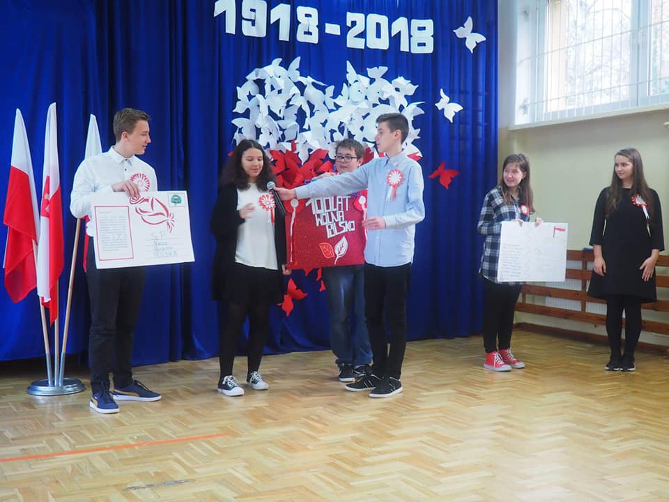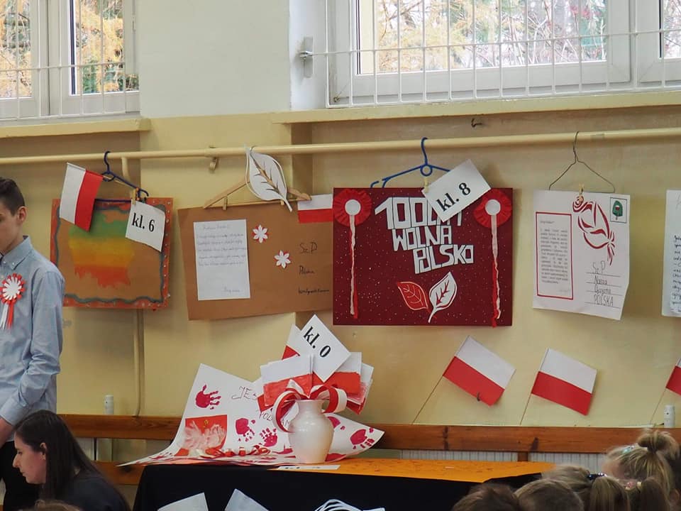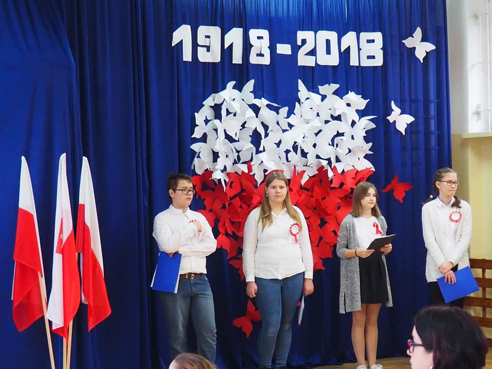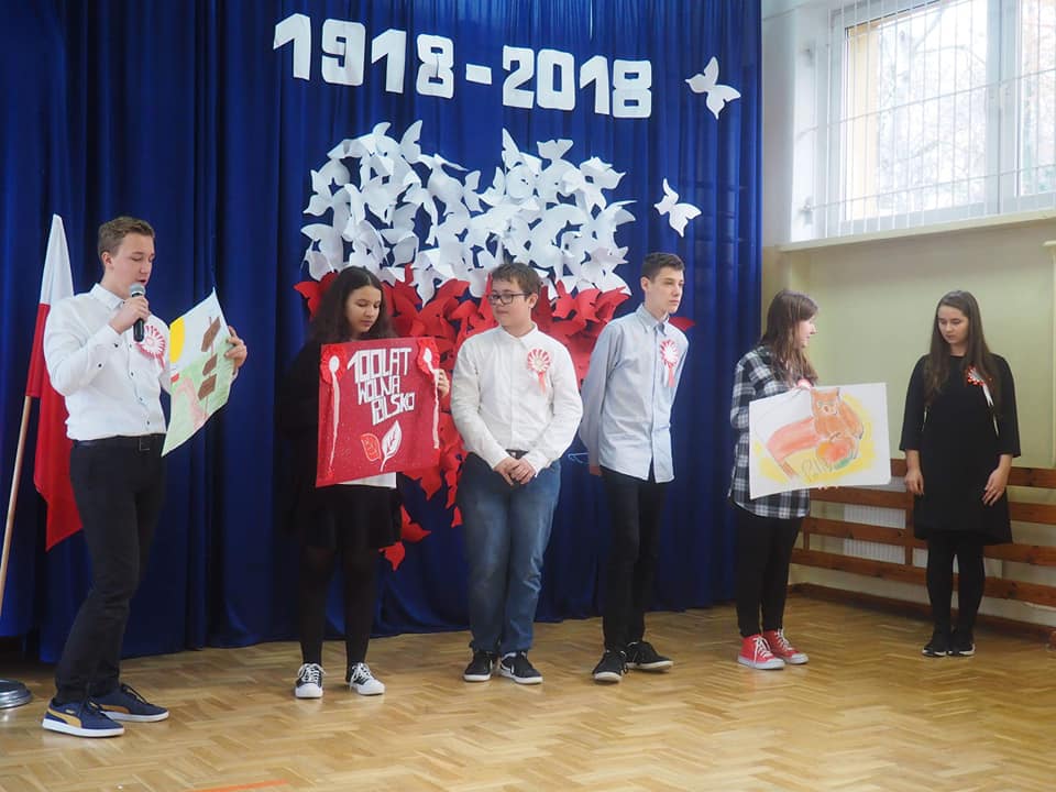 Dnia 13.11.2018r. społeczność naszego zespołu pięknie uczciła Święto 100-lecia Odzyskania Niepodległości. Uczniowie klas starszych pod kierunkiem pani Doroty Dzimińskiej zaprezentowali przedstawienie patriotyczne. Dzieci z przedszkola i szkoły podstawowej przygotowały w grupach prezenty dla Ojczyzny, które pokazały na forum społeczności. Były to: pomysłowy lapbook, mapa tematyczna, obraz patriotyczny, pięknie wykonane godło, a ponadto plakaty, pocztówki, flagi, wiersze i życzenia dla naszej ukochanej Ojczyzny. Nauczyciele wspólnie z uczniami odśpiewali hymn narodowy, a na zakończenie tej części uroczystości Samorząd Uczniowski poczęstował obecnych, własnoręcznie wykonanym tortem ze 100 babeczek !!! Tak rozpoczęły się obchody urodzin naszego kraju.