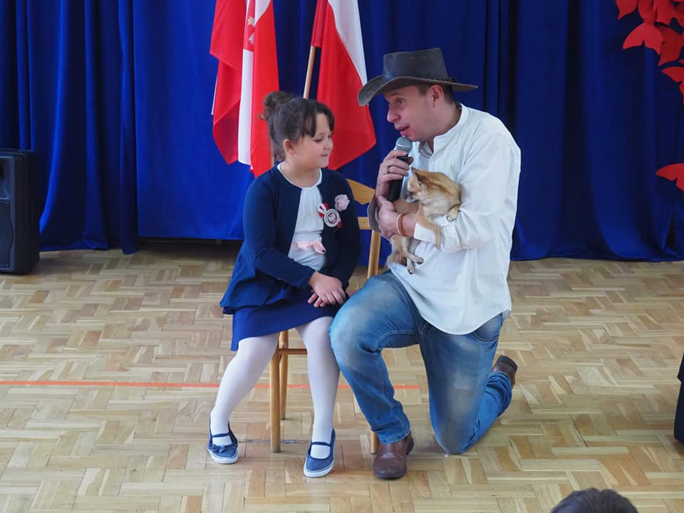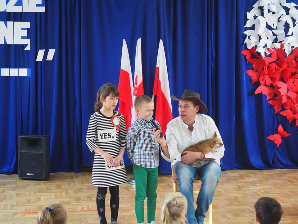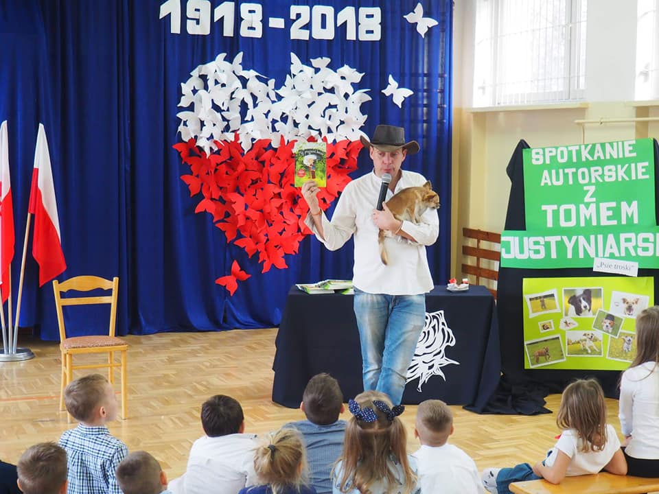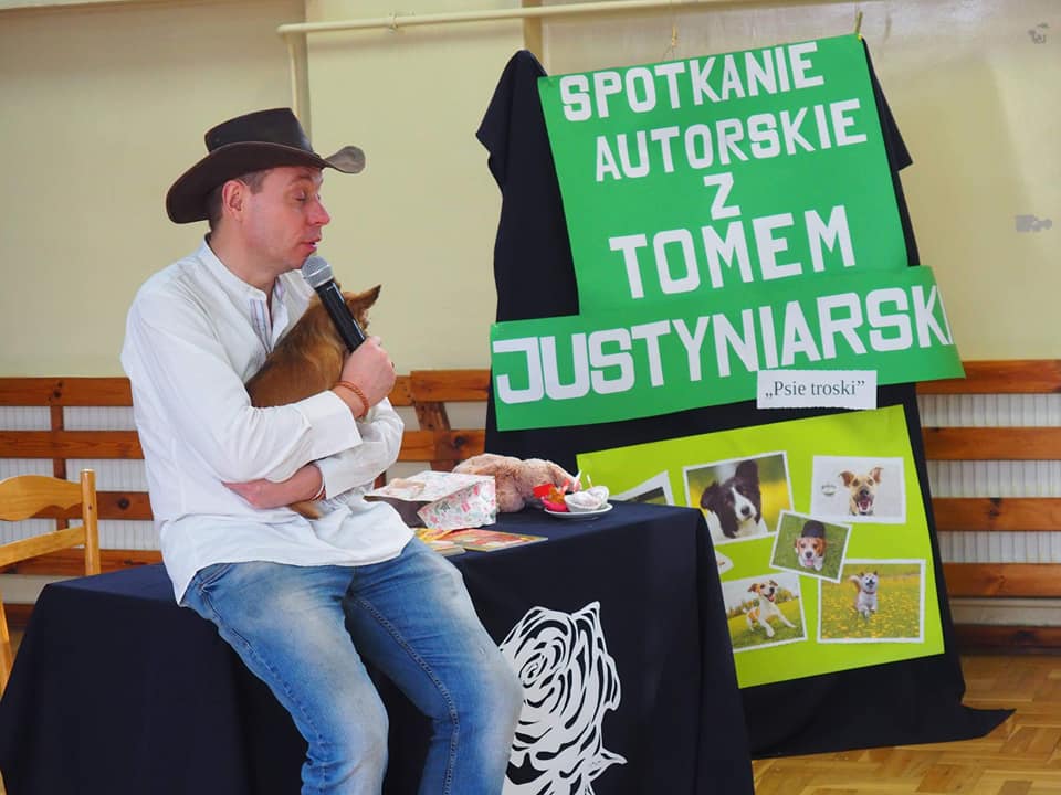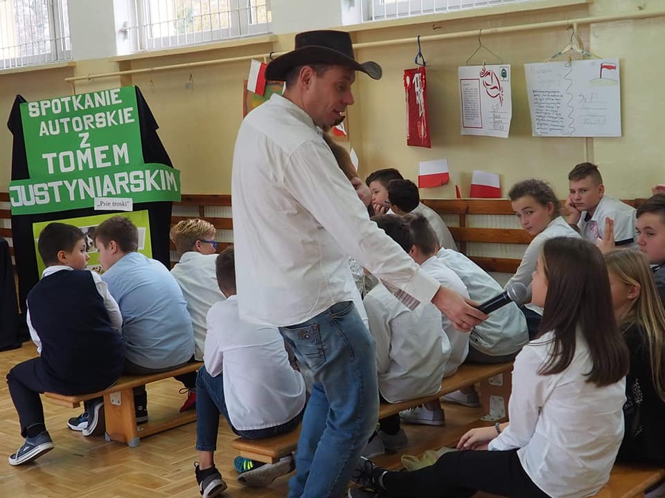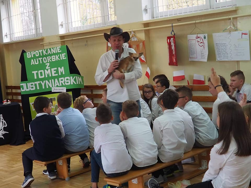 te słowa skierował dziś do nas niezwykły gość, Tom Justyniarski, pisarz i obrońca zwierząt. Od wielu lat zajmuje się ratowaniem porzuconych i niechcianych zwierząt: psów, kotów, koni oraz ptaków. Uważa, że kluczowa jest zmiana sposobu, w jaki ludzie traktują naszych braci mniejszych, a edukację w tej dziedzinie należy zaczynać już od najmłodszych lat. Nasi uczniowie