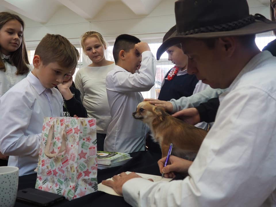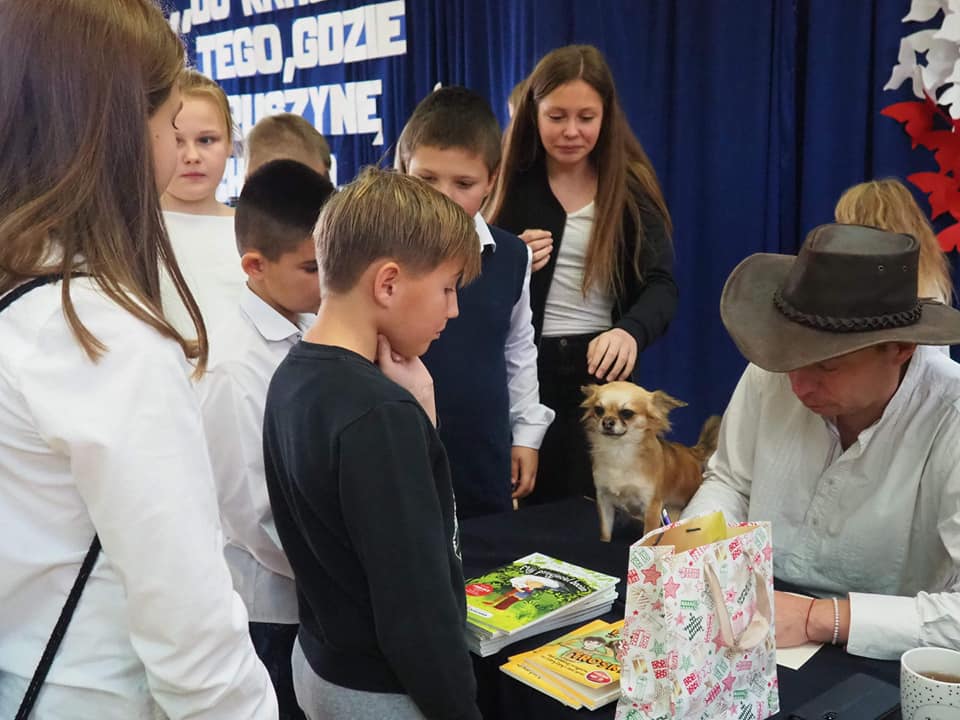 z zainteresowaniem słuchali ciekawych opowieści i sami podzielili się własnymi, dotyczącymi ratowania zwierząt. Autor „Psich trosk” opowiadał o swoich książkach, o marzeniach, przyjaźni, miłości oraz szacunku do siebie i wszystkiego co nas otacza. Towarzyszący podczas spotkania piesek, sprawił dzieciom wiele radości. Była to prawdziwa lekcja empatii i miłości do zwierząt.