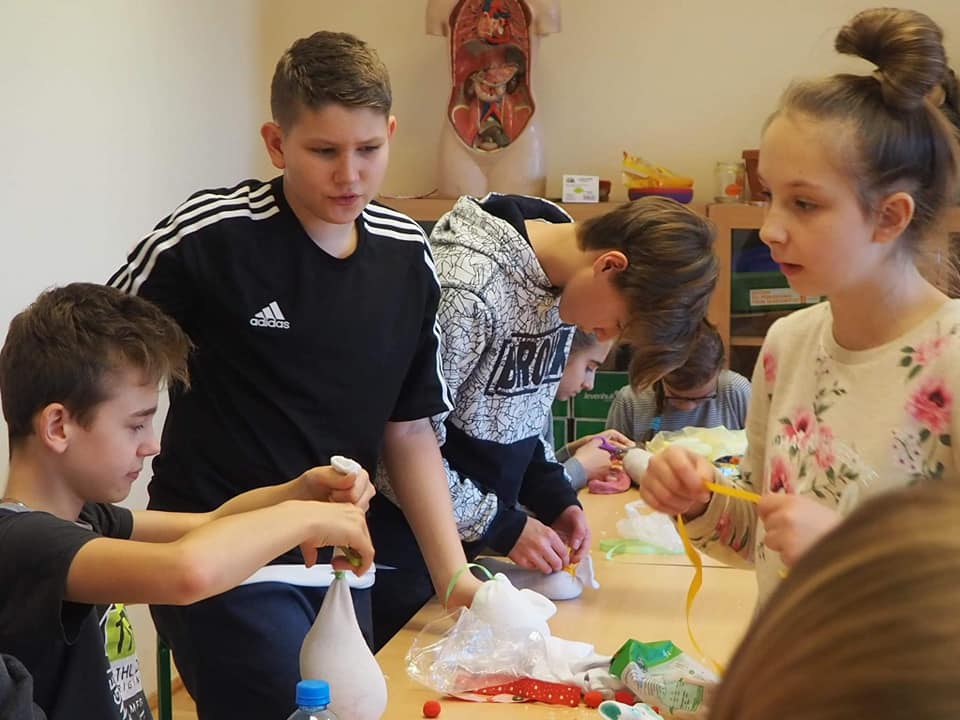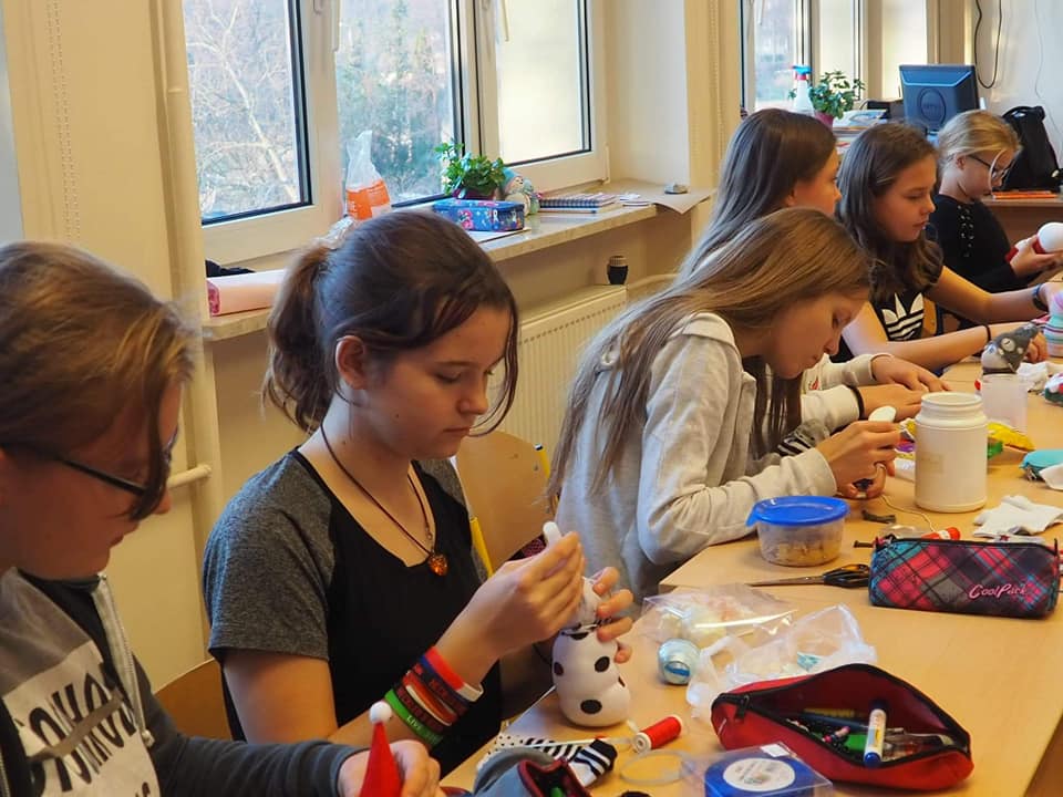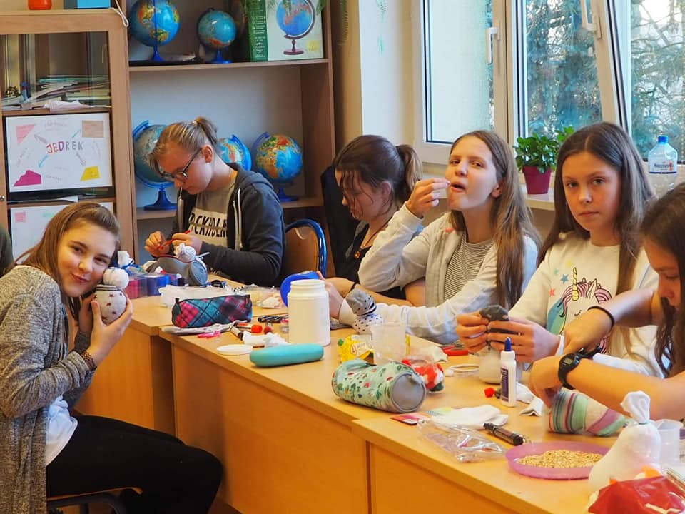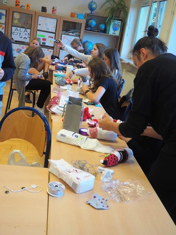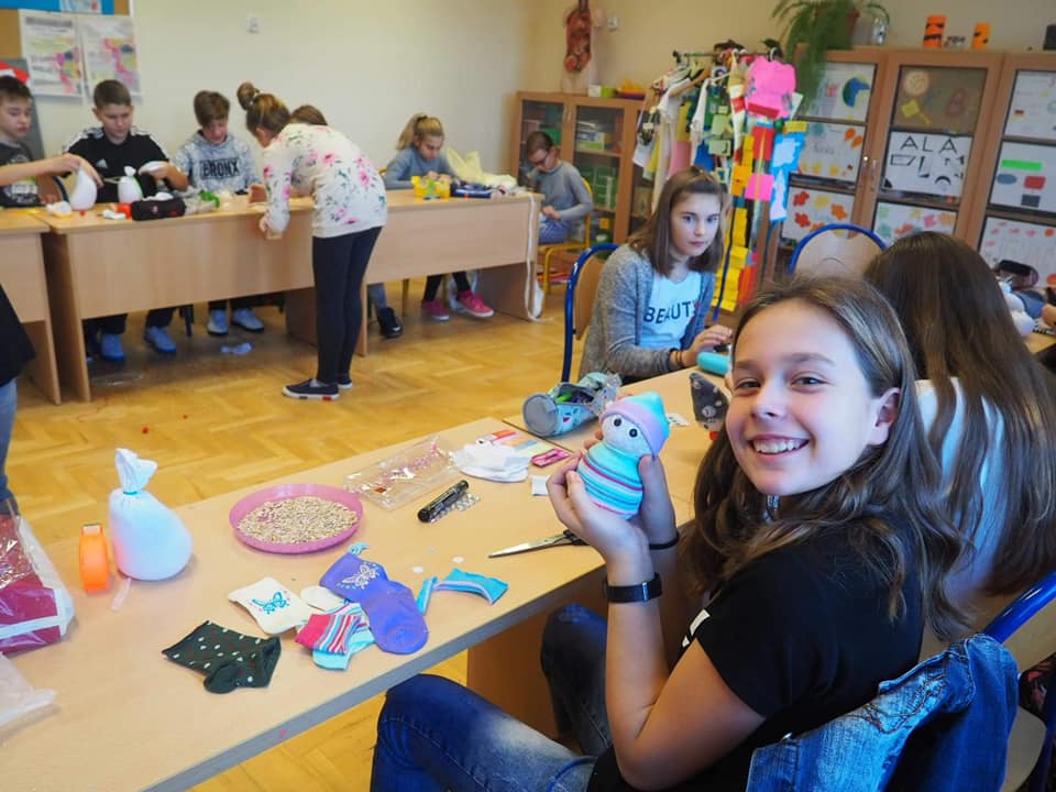 Trwają przygotowania do kiermaszu świątecznego. Uczniowie klasy 5, 6 i 7 robili dziś skarpetkowe bałwanki. W pracach już nie pierwszy raz pomagała dzieciom pani Iwona, mama naszego absolwenta, której serdecznie dziękujemy. Wspólnie stworzyliśmy bardzo oryginalne ozdoby, które mogą być ciekawą dekoracją świąteczną.