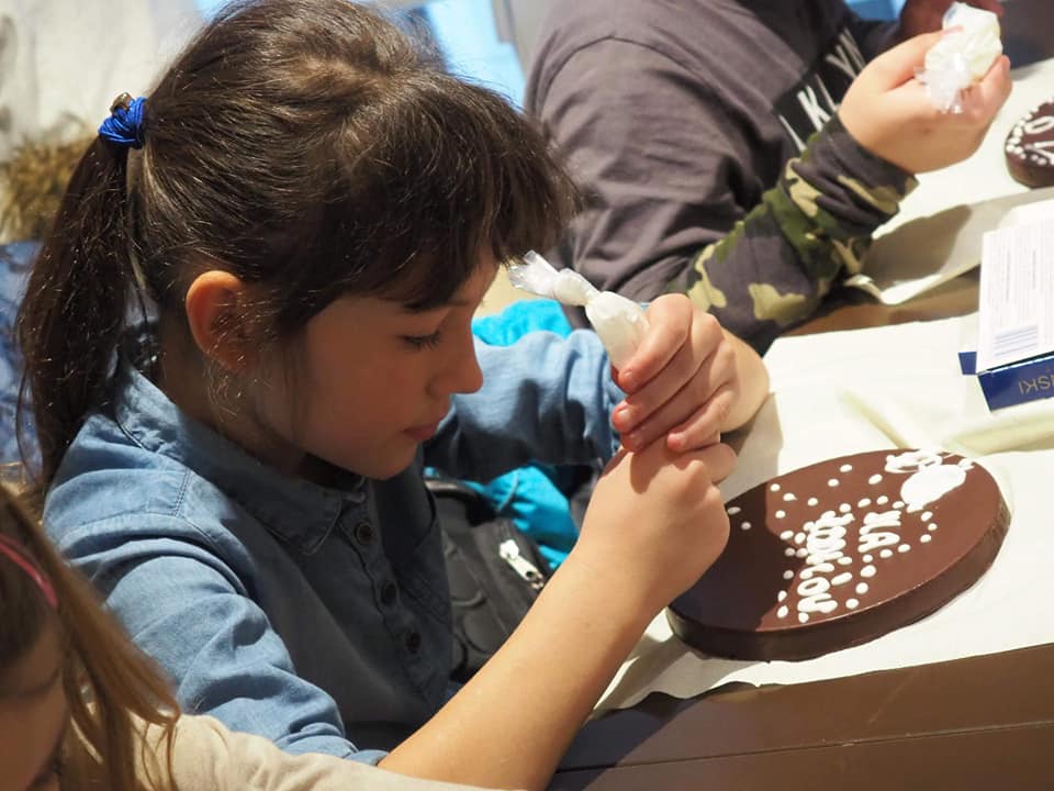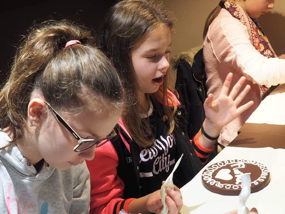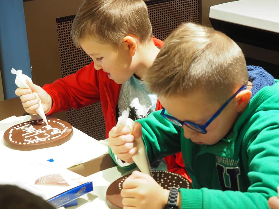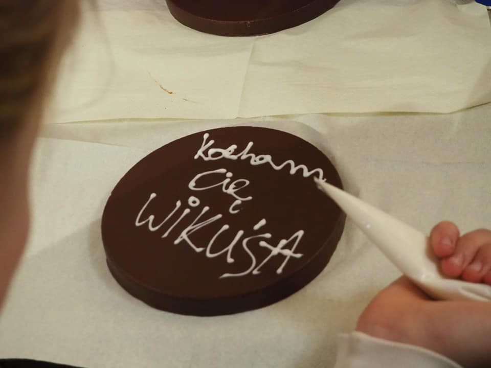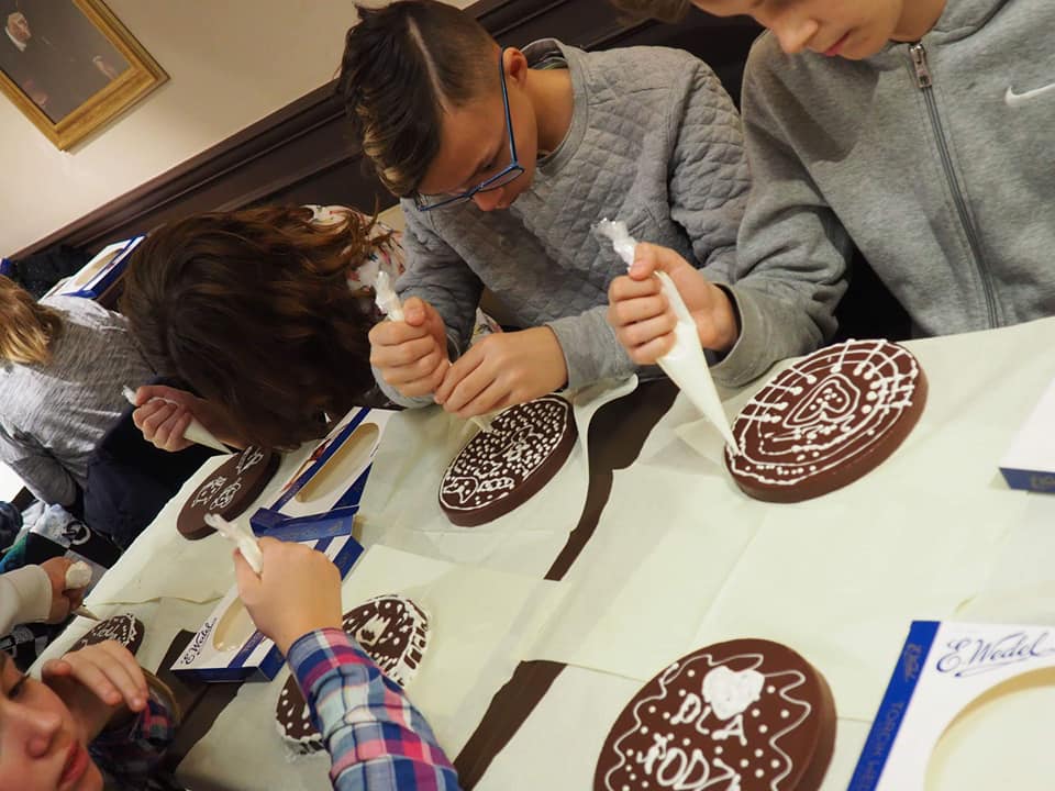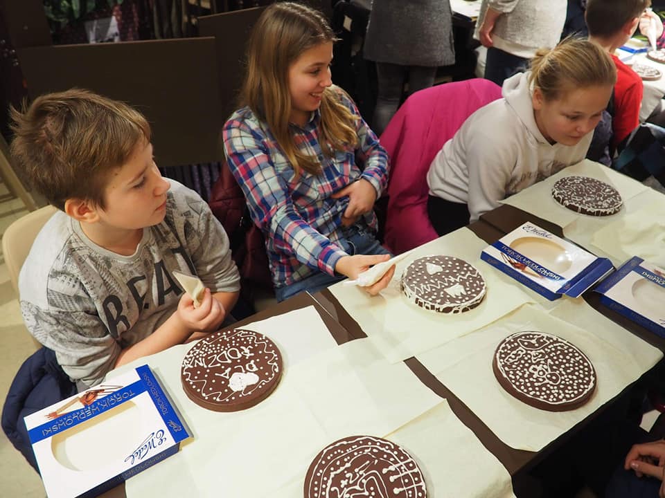 Zasłuchani w opowieść o historii rodziny Emila Wedla swobodnie oddaliśmy się słodkiej przyjemności, popijając aromatyczną czekoladę. Zabawa w Mistrza Czekolady poruszyła wyobraźnię cukierników. Z pomocą białej czekolady uczniowie stworzyli wyjątkowe dekoracje na Torcikach Wedlowskich.