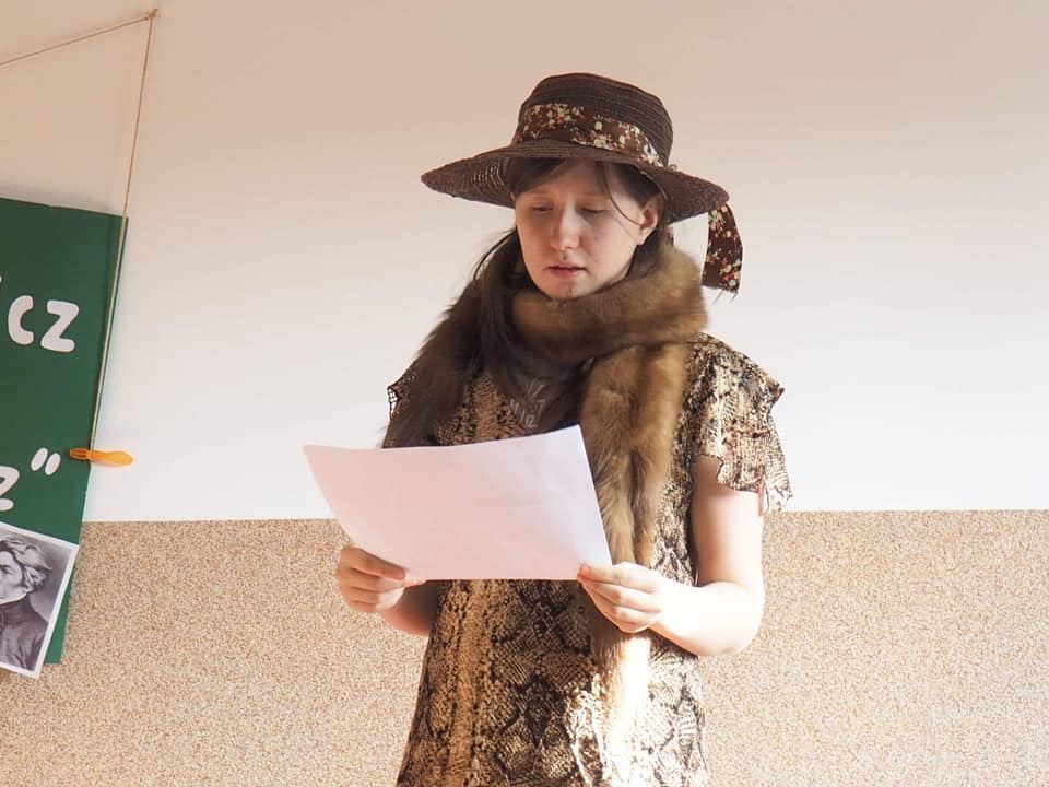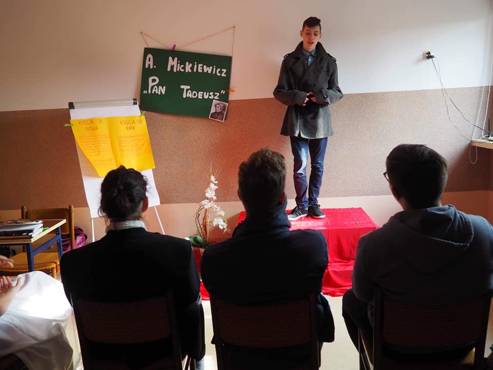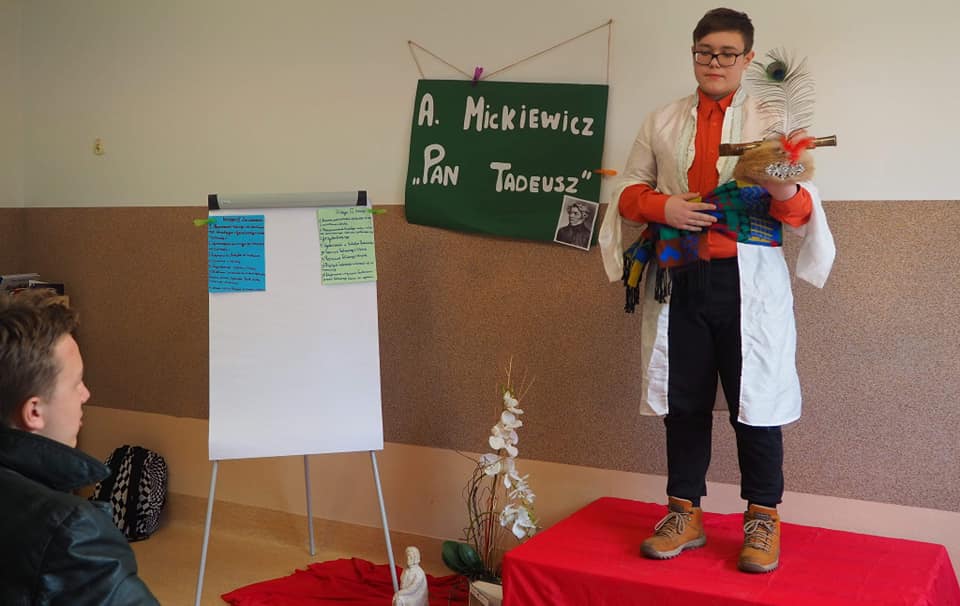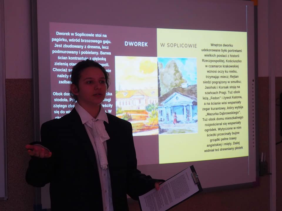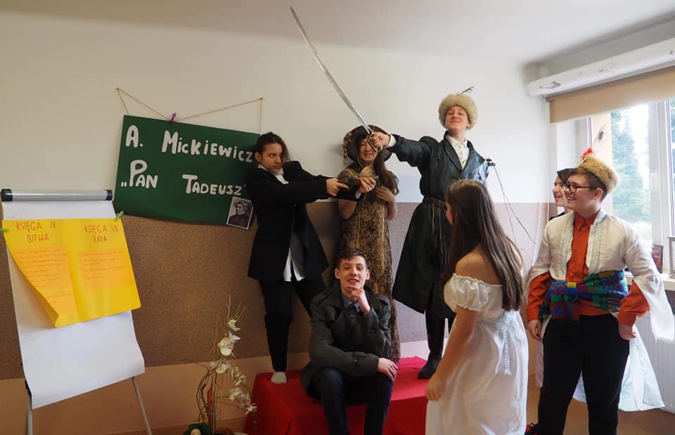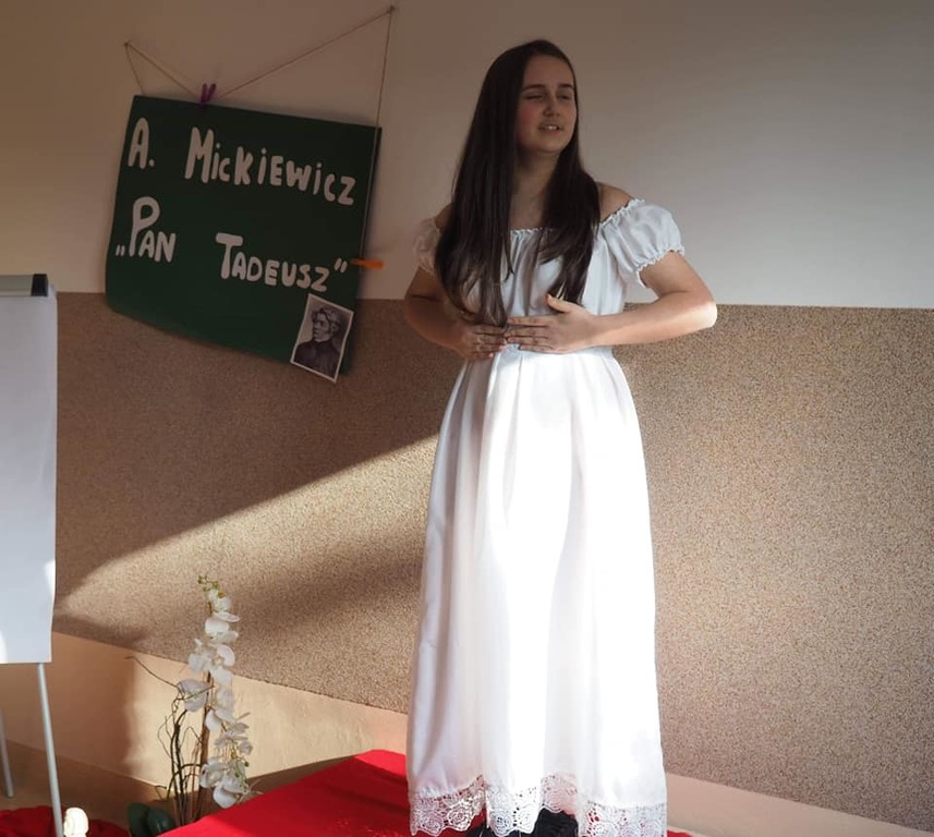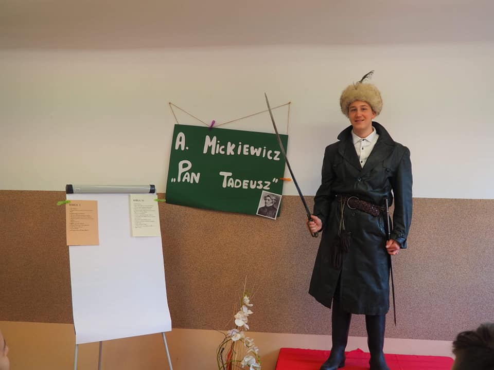 Moja mała - Wielka klasa !!! Mowa o uczniach klasy 8, którzy zmierzyli się z tekstem "Pana Tadeusza" A.Mickiewicza i w nietypowy sposób zaprezentowali efekty swojej pracy. Młodzież, korzystając z zasobów domowych szaf, przygotowała stroje charakterystyczne dla epoki romantyzmu, a jedna z dziewcząt pokusiła się nawet o samodzielne uszycie sukienki. Każdy ósmoklasista wylosował kilka tygodni wcześniej zadania, które trzeba było opracować i omówić w dowolnej formie. Były zatem plakaty, rysunki, lapbooki i prezentacje multimedialne, a uczniowie opowiadali o genezie epopei narodowej, cechach wybranych bohaterów, wadach i zaletach szlachty, nie zabrakło też ciekawostek z planu filmowego "Pana Tadeusza". Taka forma omawiania lektury spodobała się nastolatkom do tego stopnia, że z chęcią zostali po lekcjach, żeby obejrzeć wszystkie prezentacje. Jestem dumna, że młodzież potraktowała to wyzwanie poważnie i tak gorliwie zajęła się opracowaniem zaproponowanych zagadnień.