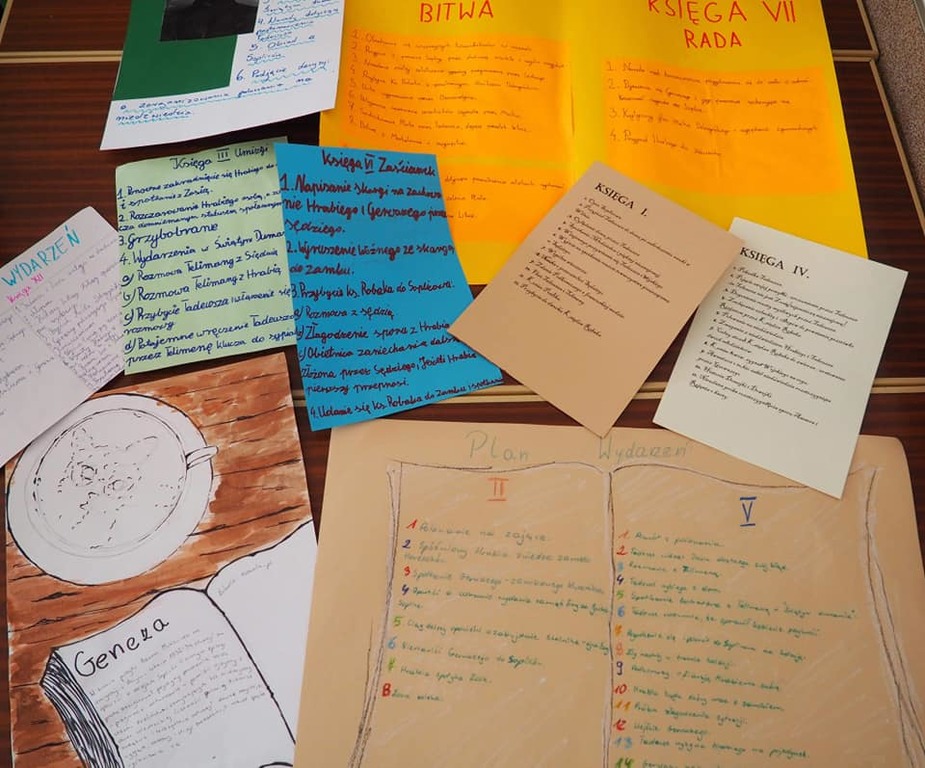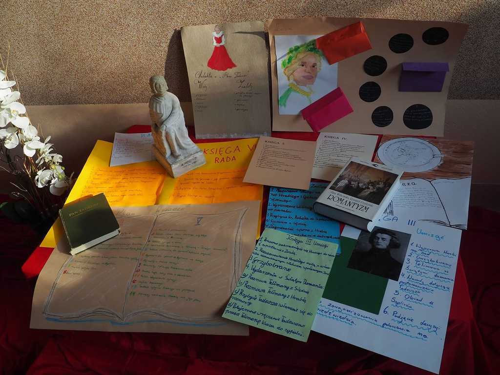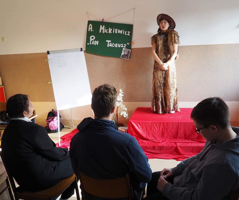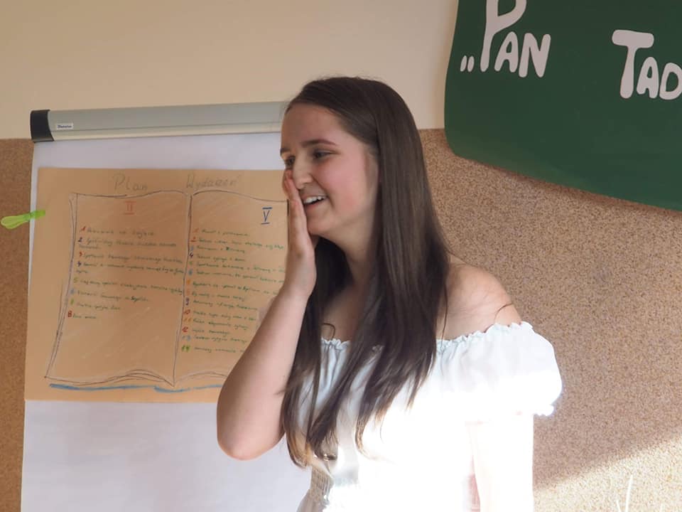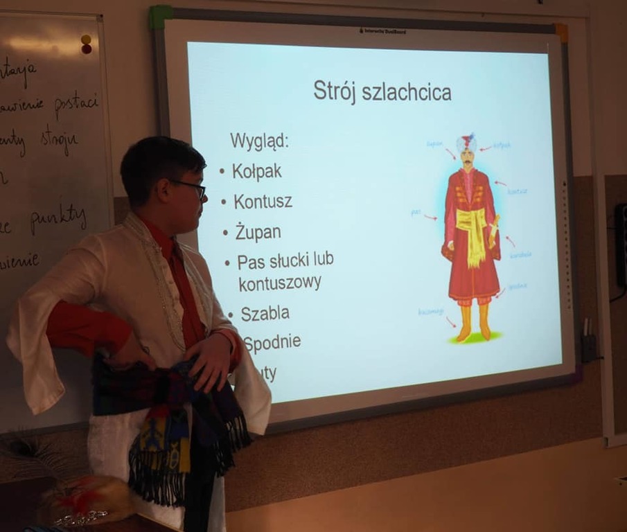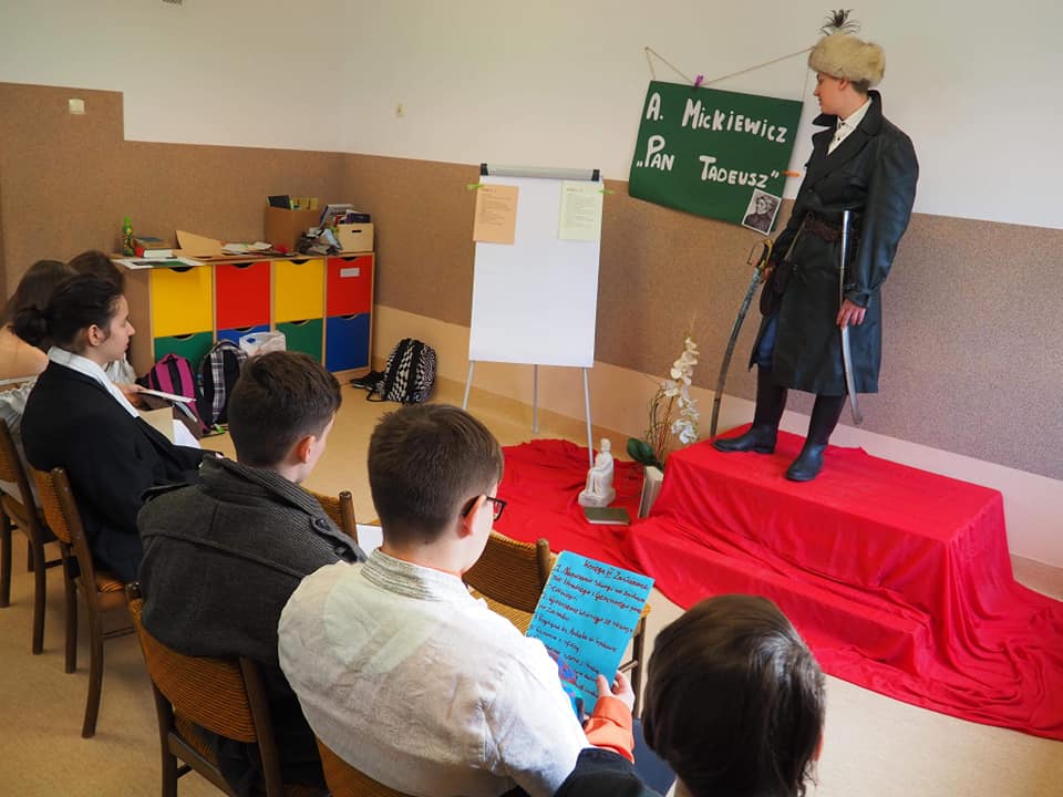 Moja mała - Wielka klasa !!! Mowa o uczniach klasy 8, którzy zmierzyli się z tekstem "Pana Tadeusza" A.Mickiewicza i w nietypowy sposób zaprezentowali efekty swojej pracy. Młodzież, korzystając z zasobów domowych szaf, przygotowała stroje charakterystyczne dla epoki romantyzmu, a jedna z dziewcząt pokusiła się nawet o samodzielne uszycie sukienki. Każdy ósmoklasista wylosował kilka tygodni wcześniej zadania, które trzeba było opracować i omówić w dowolnej formie. Były zatem plakaty, rysunki, lapbooki i prezentacje multimedialne, a uczniowie opowiadali o genezie epopei narodowej, cechach wybranych bohaterów, wadach i zaletach szlachty, nie zabrakło też ciekawostek z planu filmowego "Pana Tadeusza". Taka forma omawiania lektury spodobała się nastolatkom do tego stopnia, że z chęcią zostali po lekcjach, żeby obejrzeć wszystkie prezentacje. Jestem dumna, że młodzież potraktowała to wyzwanie poważnie i tak gorliwie zajęła się opracowaniem zaproponowanych zagadnień.
