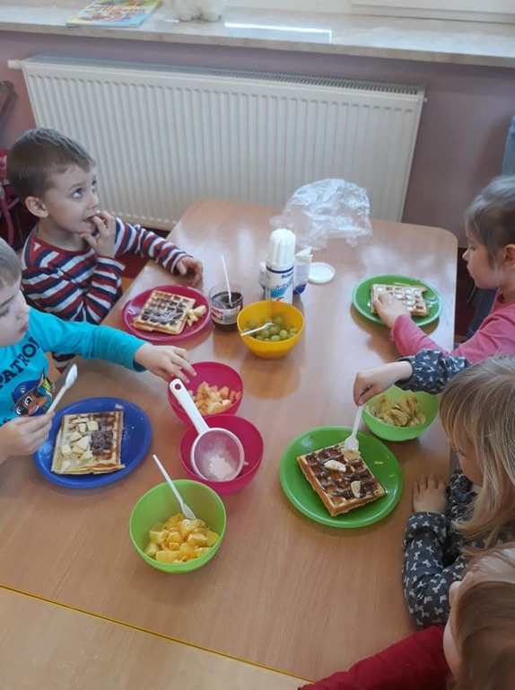 Dzisiaj, z okazji Tłustego Czwartku przedszkolaki z grupy Żabki przygotowały pyszne gofry z bitą śmietaną, nutellą i oczywiście świeżymi owocami. Dzieci przy pomocy nauczycielki przygotowały masę gofrową, a następnie ciocia Ewa wysmazyla je w gofrownicy. Na zajęciach utrwaliliśmy sobie zasady kulturalnego zachowania się przy stole oraz bezpieczeństwa w kuchni. Na koniec maluchy przystąpiły do wyczekanej degustacji.