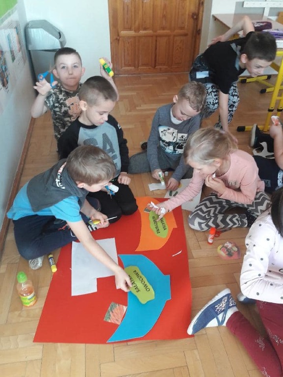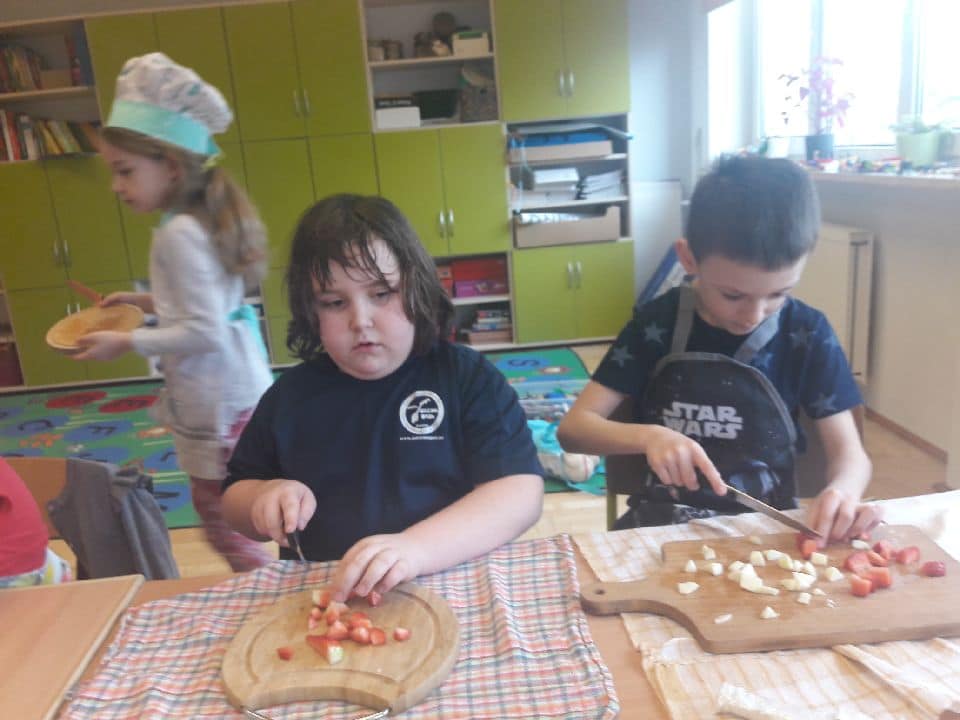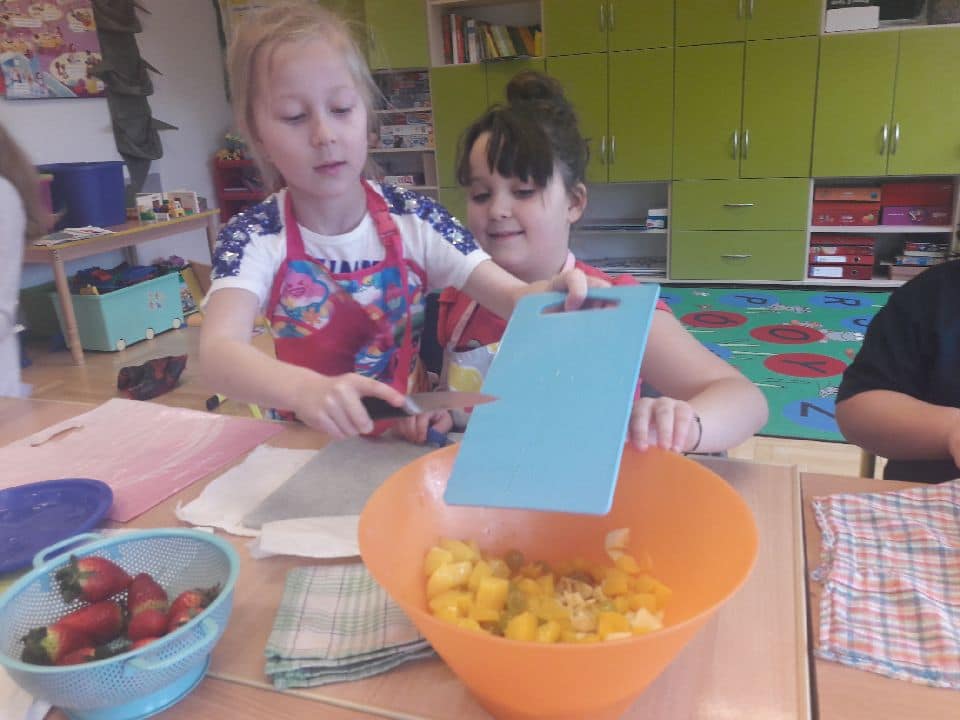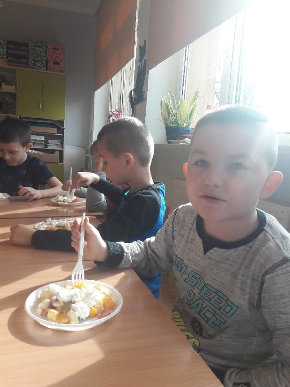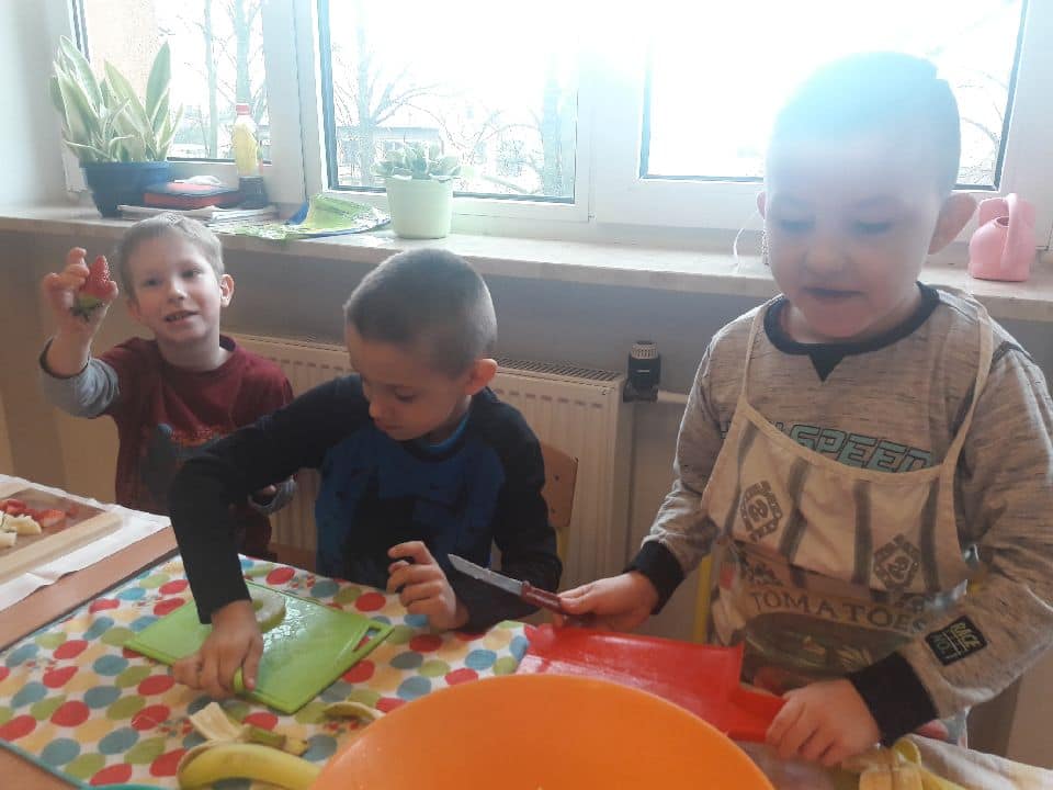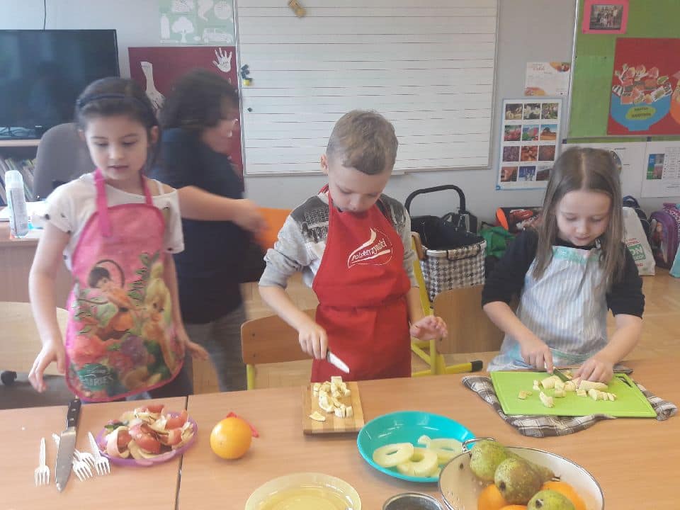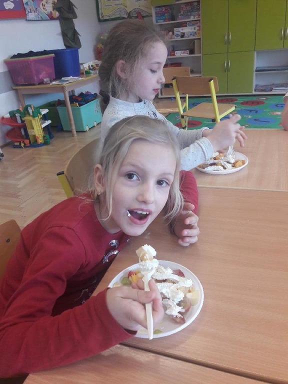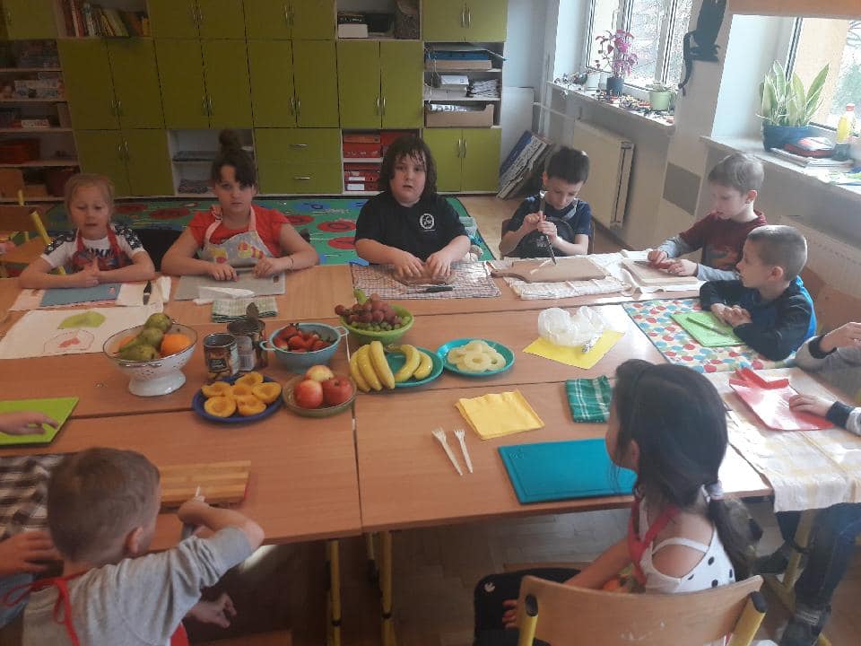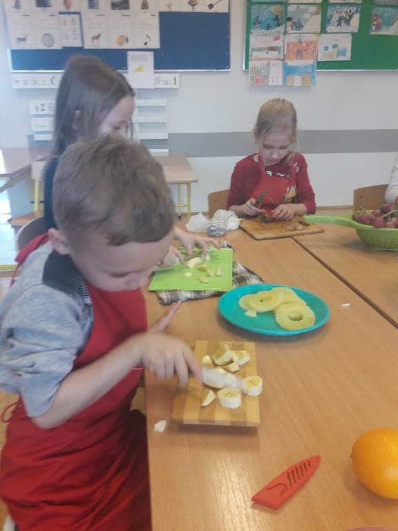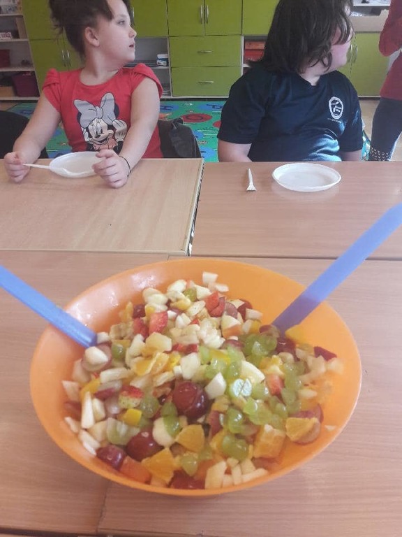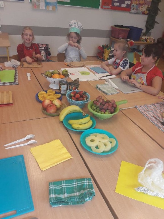 Wszyscy dobrze wiemy, że aby być zdrowym , silnym i mądrym musimy dbać o swoje ciało tj. odpowiednio do pogody się ubierać, uprawiać sport, spędzać dużo czasu na świeżym powietrzu, a także zdrowo się odżywiać. Wszystkie te zasady w minionym tygodniu utrwalali sobie uczniowie klasy pierwszej podczas codziennych zajęć. Dowiedzieliśmy się przede wszystkim wiele ciekawych rzeczy na temat zdrowego odżywiania, jak dużą rolę pełni ono dla prawidłowego rozwoju każdego organizmu. Dowiedzieliśmy się gdzie szukać jakich witamin i jaką ważną pełnią one rolę w naszym zdrowiu i co się dzieje, kiedy którejś z nich nam zabraknie. Na koniec tygodnia uczniowie przygotowali przepyszną sałatkę owocową, prawdziwą bombę witaminową. Bo wiadomo, że witaminy w takiej postaci smakują wszystkim. MNIAM MNIAM…….